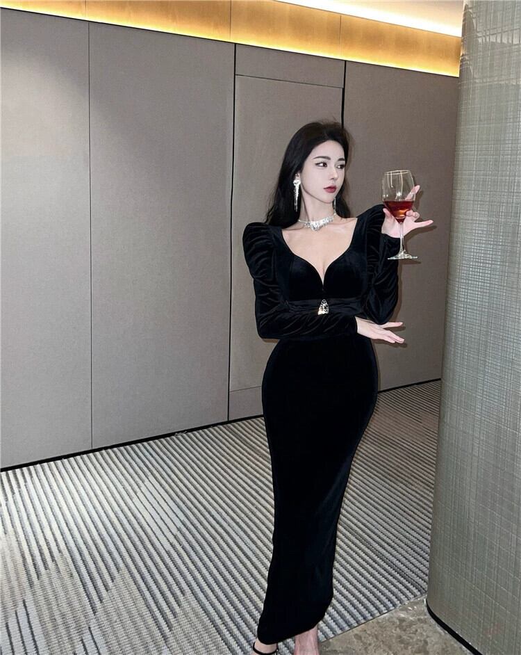 フレンチヘップバーンスタイルブラックイブニングドレスハイエンドライトラグジュアリーニッチセクシーローカットVネック長袖ゴールドベルベットドレス ロング yeyij80374449076