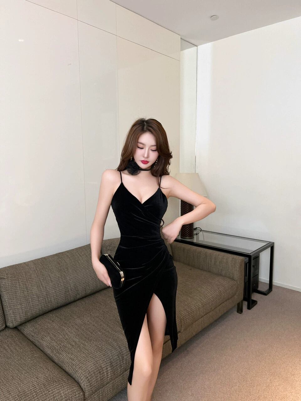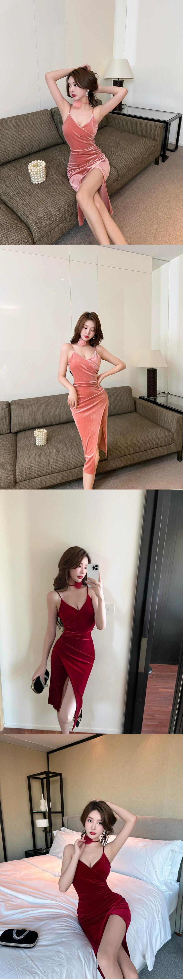 イブニングドレス女性宴会ナイトクラブナイトクラブハイエンドゴールドベルベットセクシーな V ネックミッドレングスサスペンダードレス Vネック yeyij97235193145