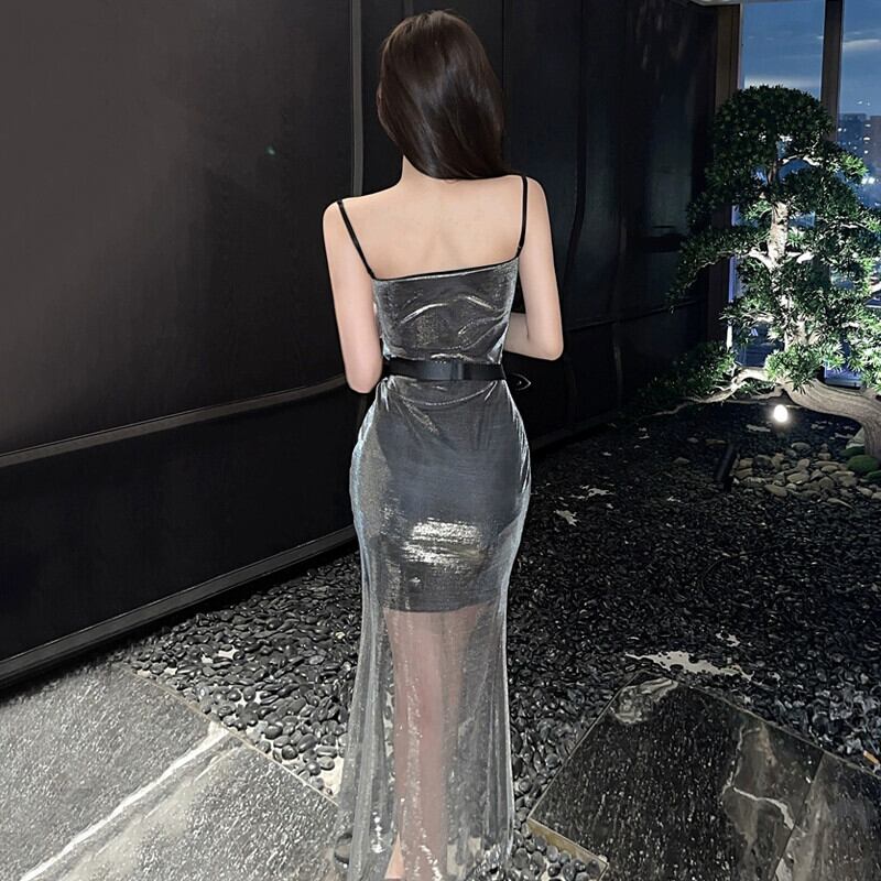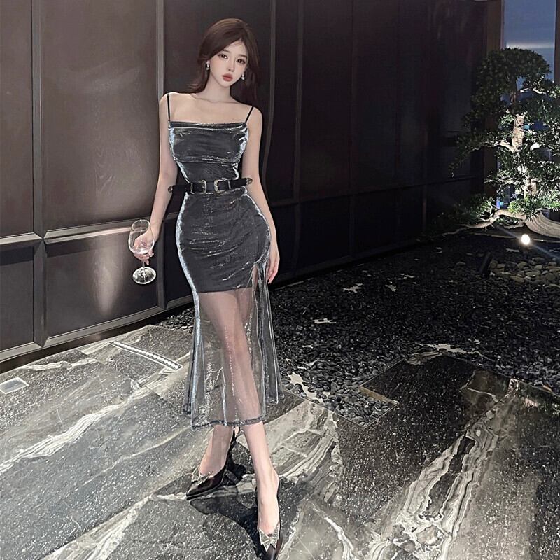 ナイトクラブ、ナイトクラブ、バーのイブニングドレスの女性、輝くシルクのセクシーなメッシュスリットミッドレングスのサスペンダードレス yeyij36354960657
