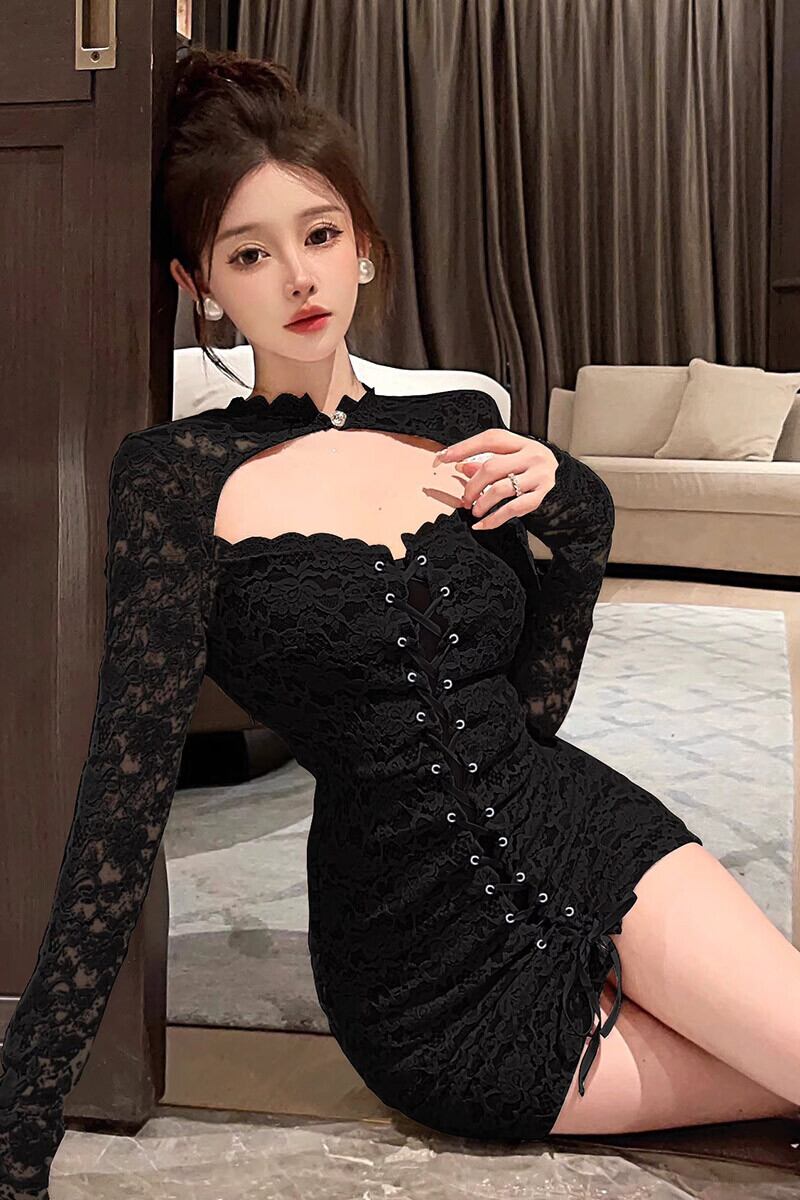 Pogenic ヤングの黒いレースのセクシーな中空修正チャイナ ドレス生放送女性アンカー ブラック yeyij16315457002