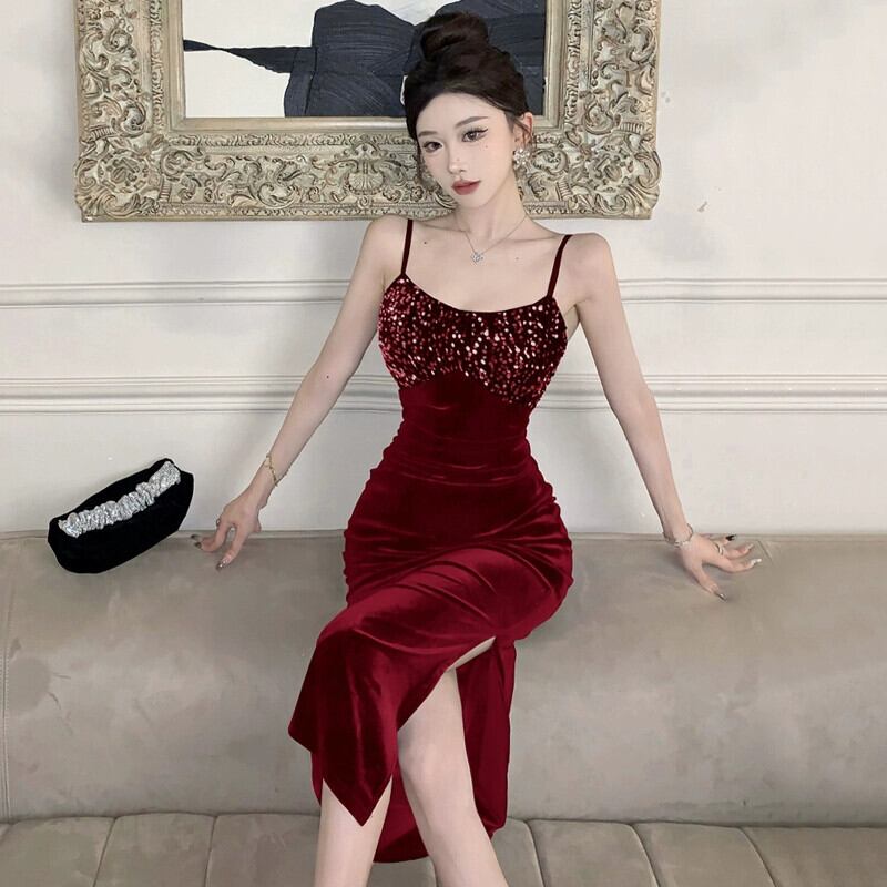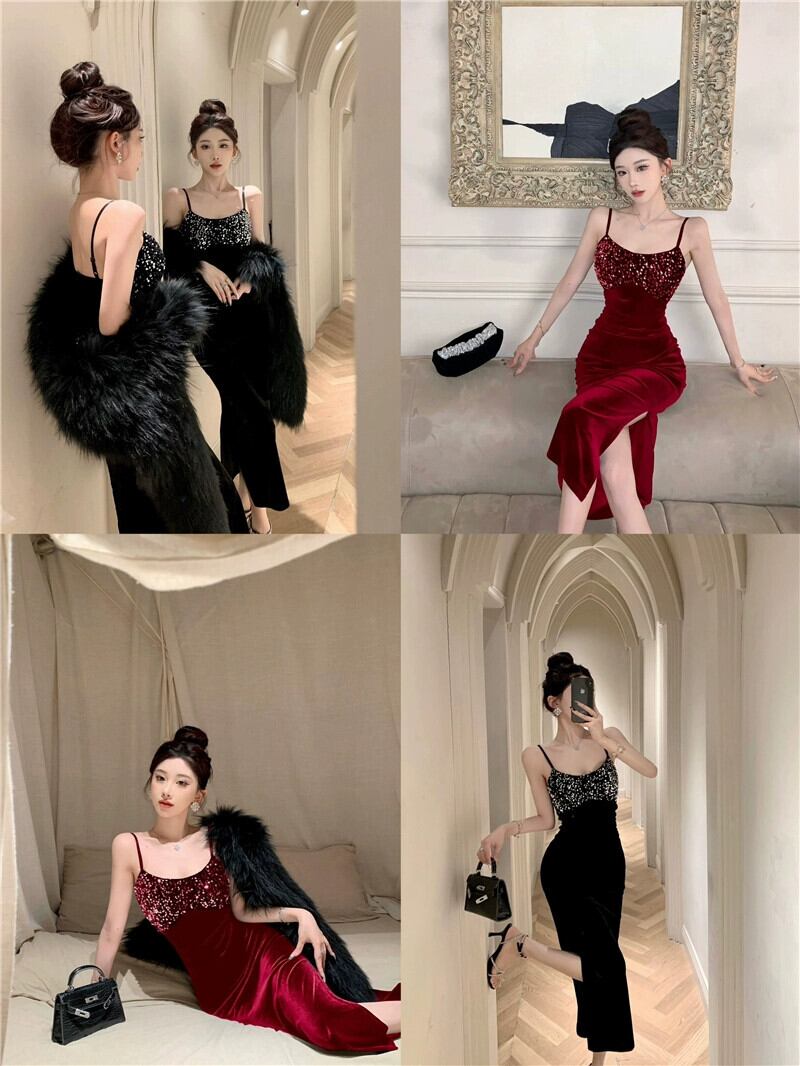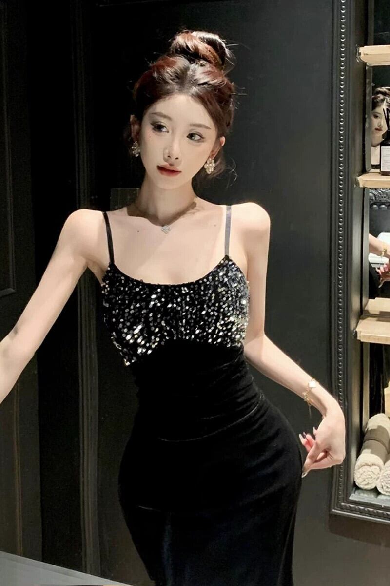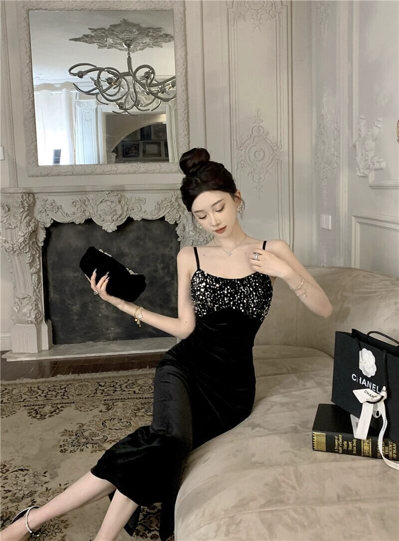 フランスのイブニングドレスの女性、ハイエンドの秋と冬の宴会ニッチブラック重工業スパンコール付きゴールドベルベットサスペンダードレス オータム 秋物 ウィンター 冬物 yeyij41946342844