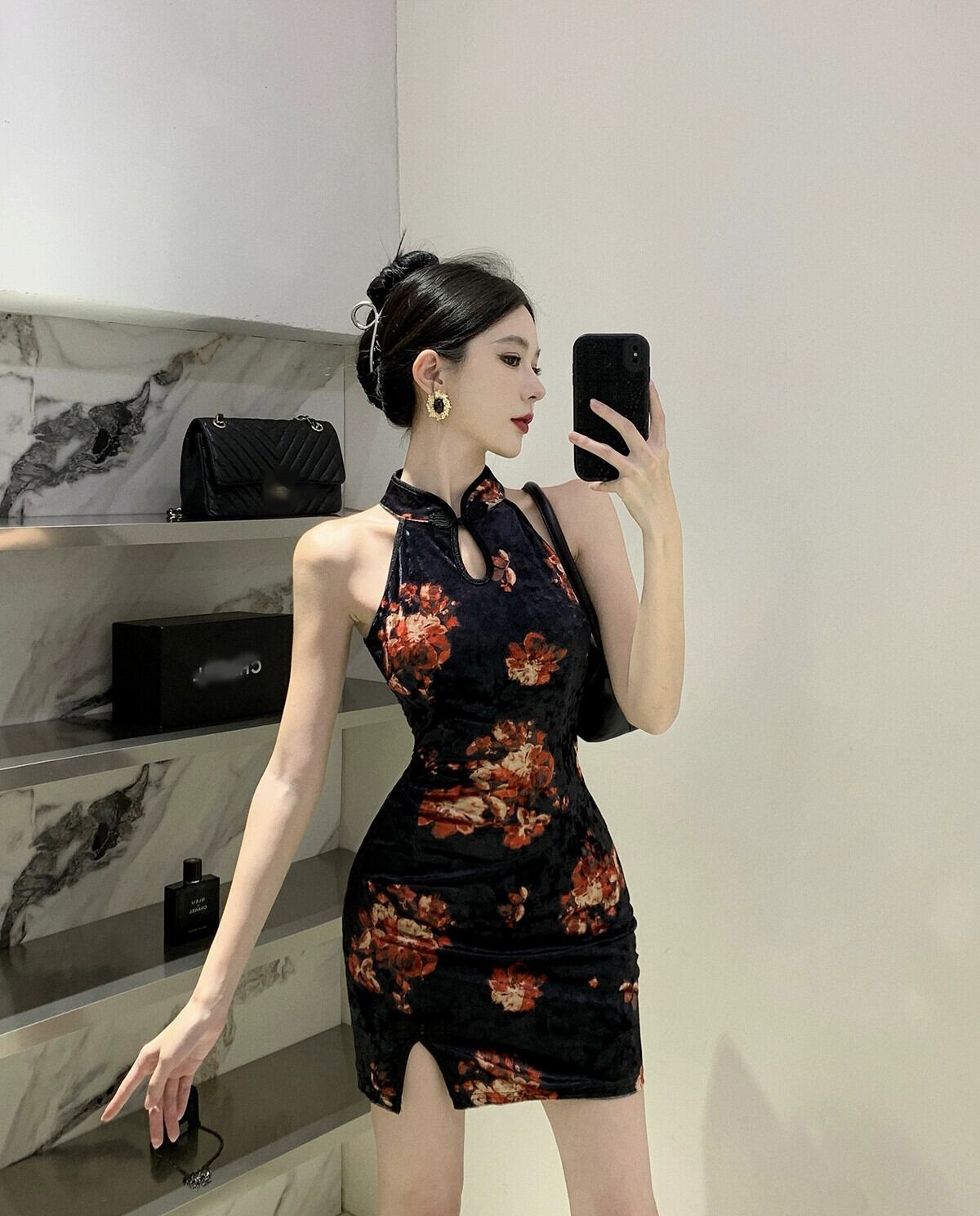 Pogenic 衣類生放送女性アンカー、ハイエンドの若いレトロなプリントのセクシーなオフショルダー ホルターネック チャイナ ドレス yeyij94654796499