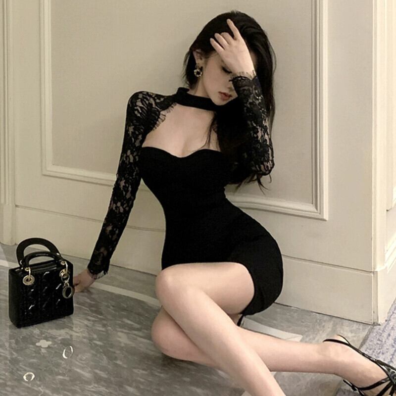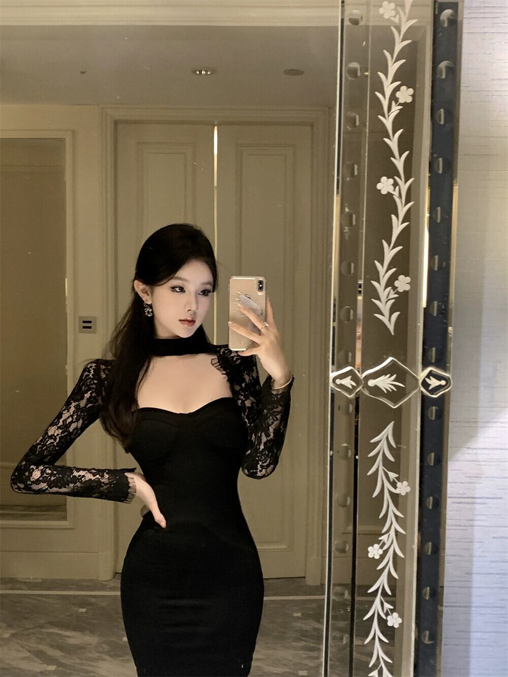 生放送服女性アンカー pogenic 黒若いセクシーな中空レースのスプライシング改良版チャイナ ドレス ブラック yeyij63813044968