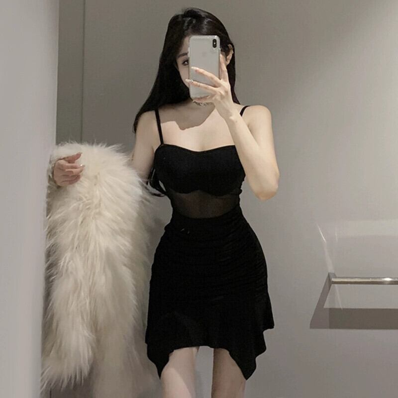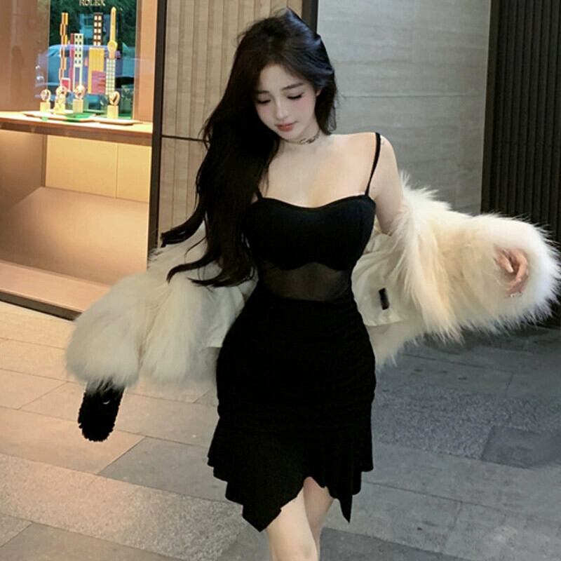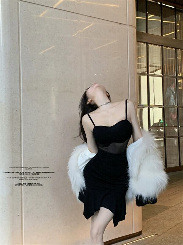 -エンドリトルブラックドレス女性フレンチスタイル純粋な欲望甘いネクタイセクシーなメッシュスプライシングブラックフィッシュテールサスペンダードレス 大人ガーリー スウィート キュート カジュアル ピュア yeyij87515949839