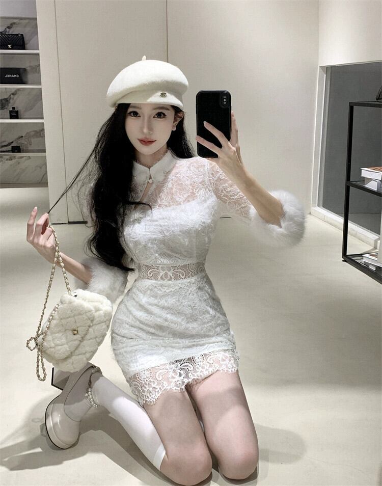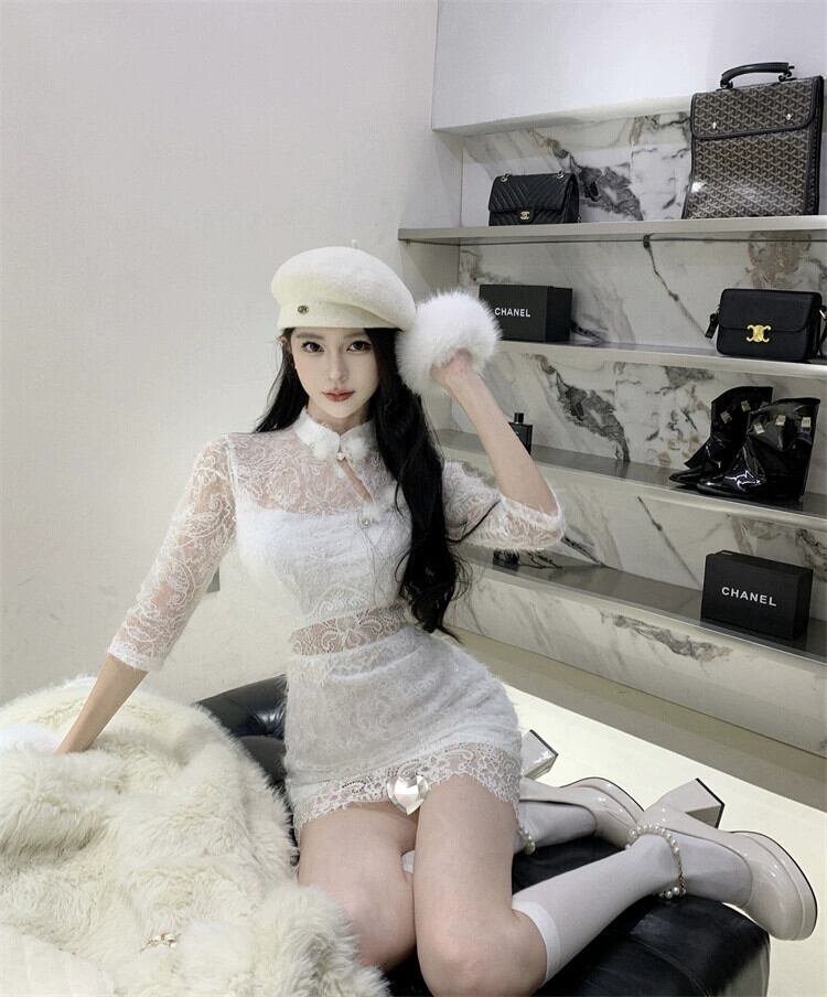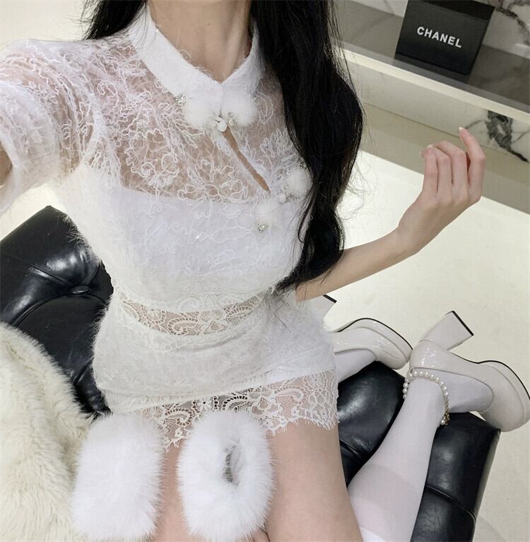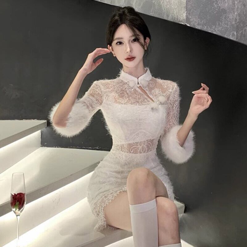 生放送服女性アンカー pogenic 白若いセクシーなレースメッシュスプライシング改良版チャイナドレス ホワイト yeyij96527051632