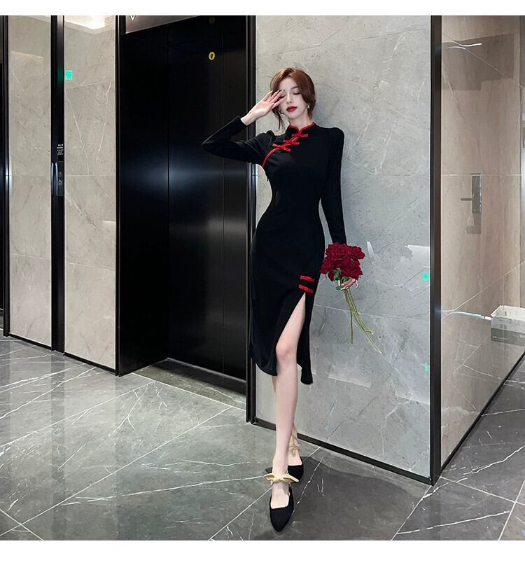 改良版のチャイナドレス女性の新しい中国風の秋の新しい若いスタイルのレトロなバックル黒の中国風ドレス ブラック オータム 秋物 yeyij59810071798