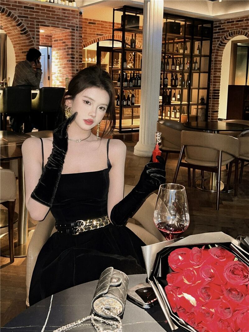 フランスのイブニングドレス、ハイエンドでエレガントな、ハイエンドの女性ヘップバーンスタイルのブラックゴールドベルベットサスペンダードレス yeyij91517439310