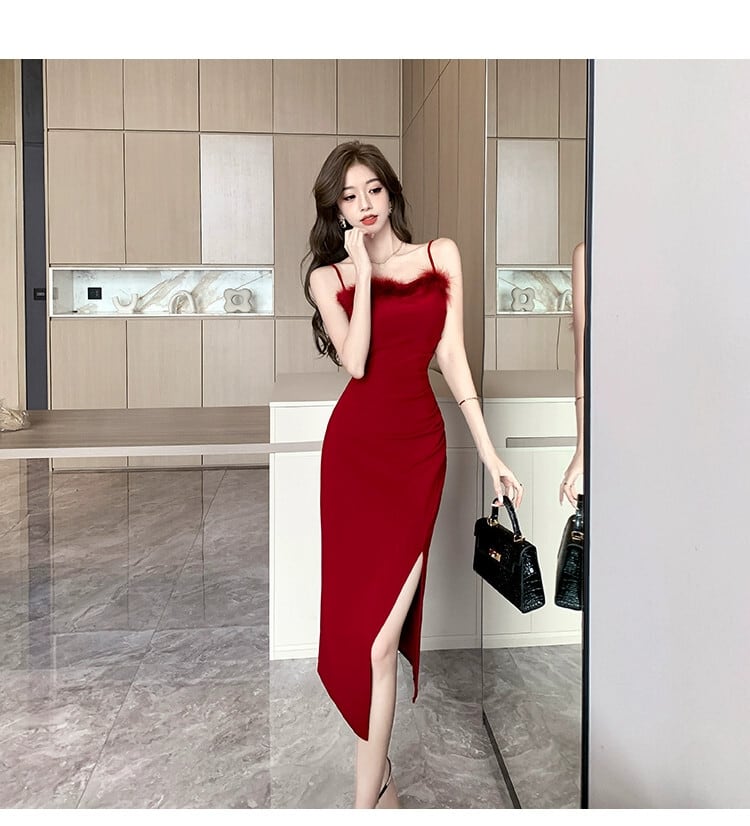 フランスのイブニングドレスの女性、高級宴会気質、年次総会、赤い毛皮のようなセクシーなロングサスペンダードレス レッド yeyij81578308111