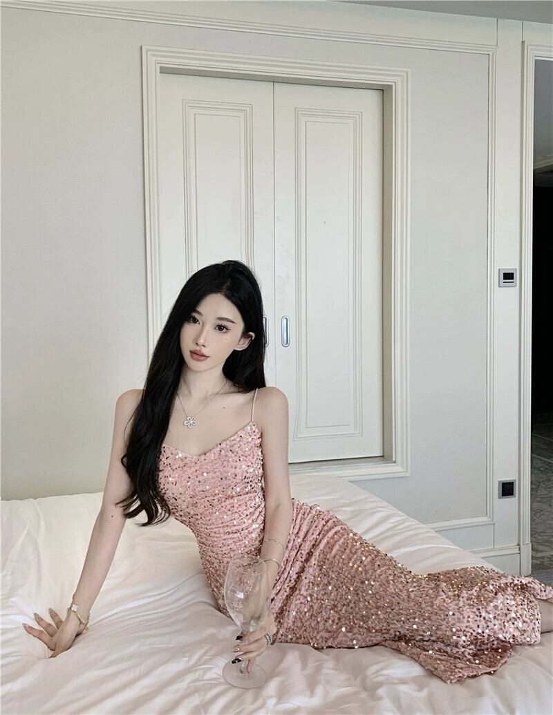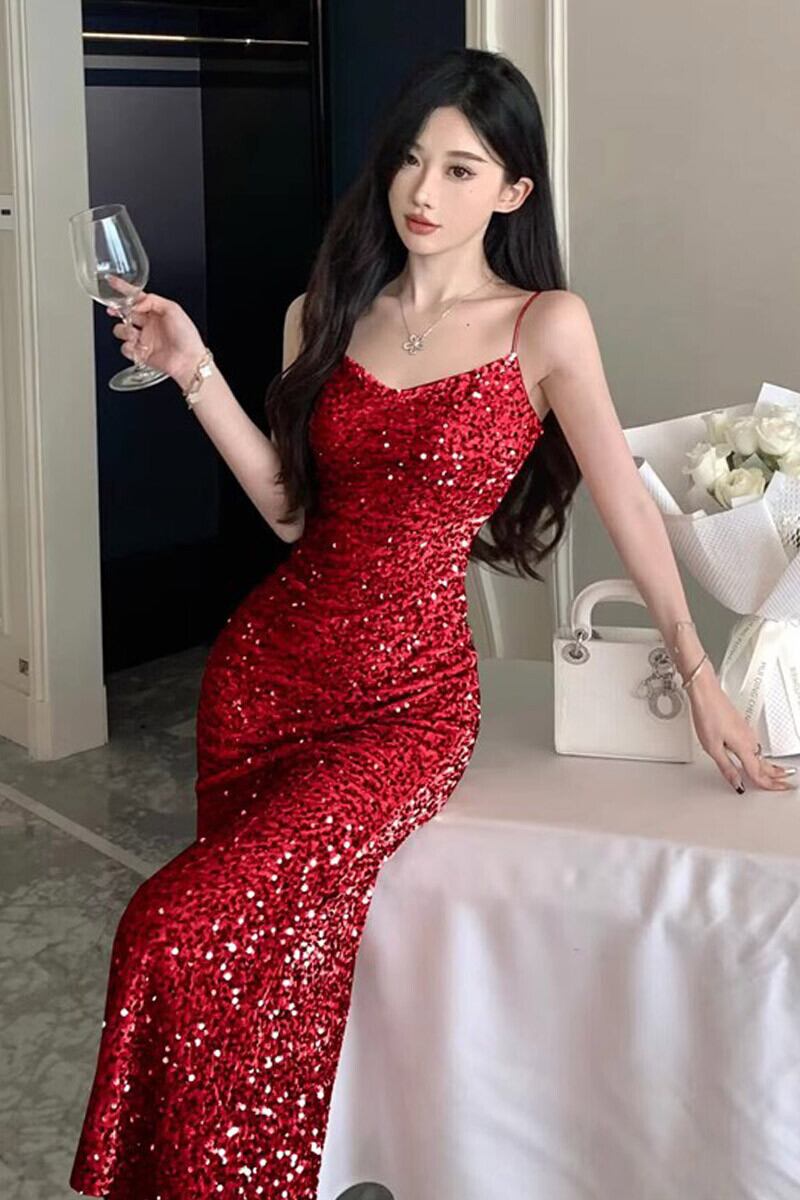 赤いスパンコールのイブニングドレスの女性、高級年末パーティー宴会、ゴールドベルベットのセクシーなロングフィッシュテールサスペンダードレス レッド yeyij21510161156