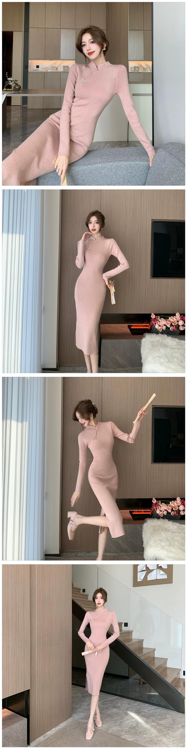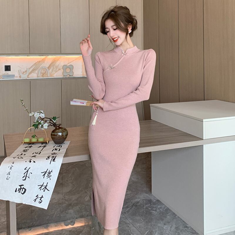 チャイナドレス女性の改良版、新しい中国風の秋服、若い日常着、ミドル丈のニットボトムドレス オータム 秋物 yeyij50541014896