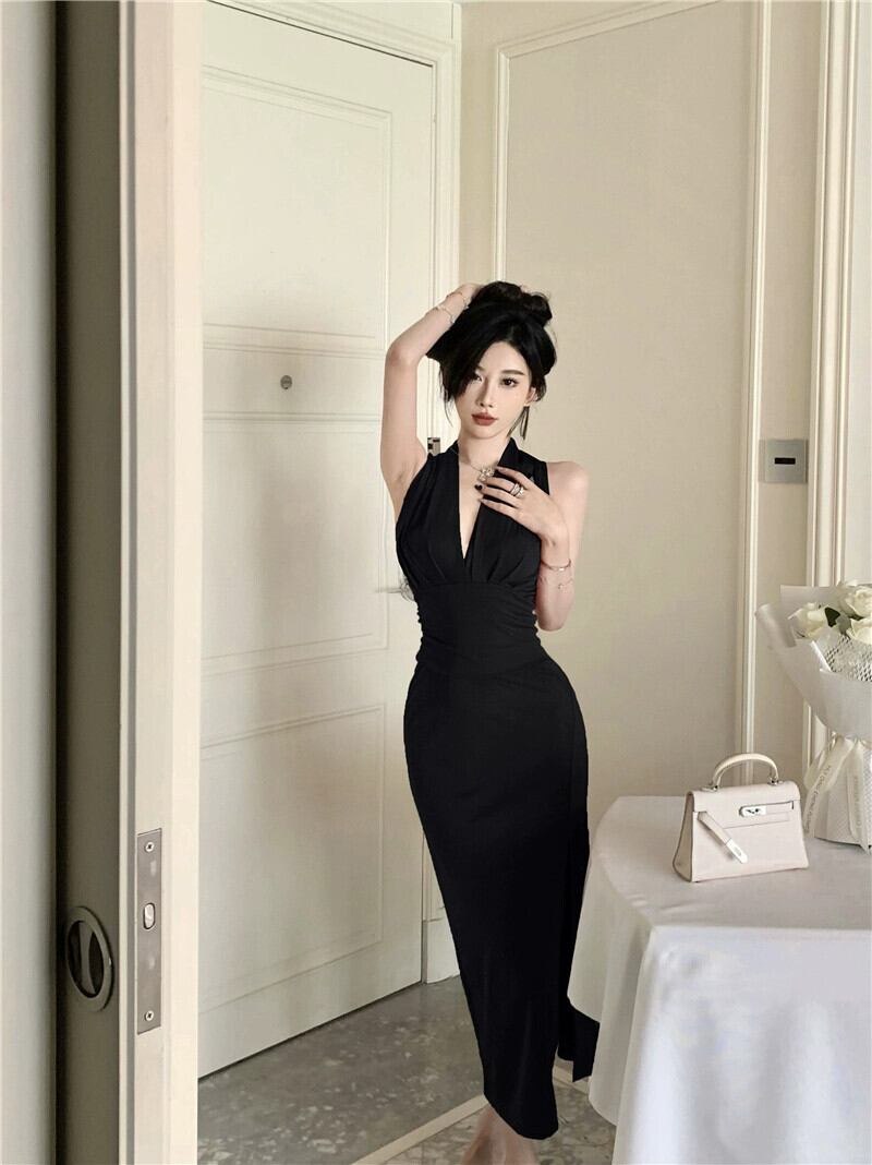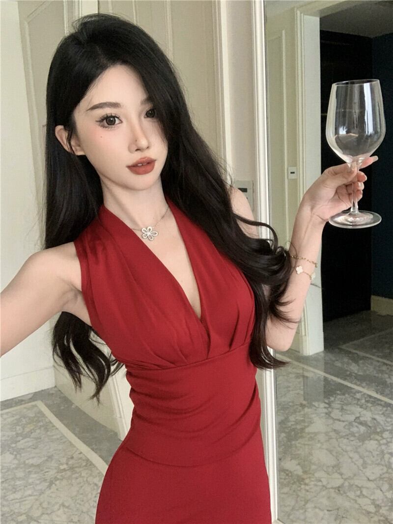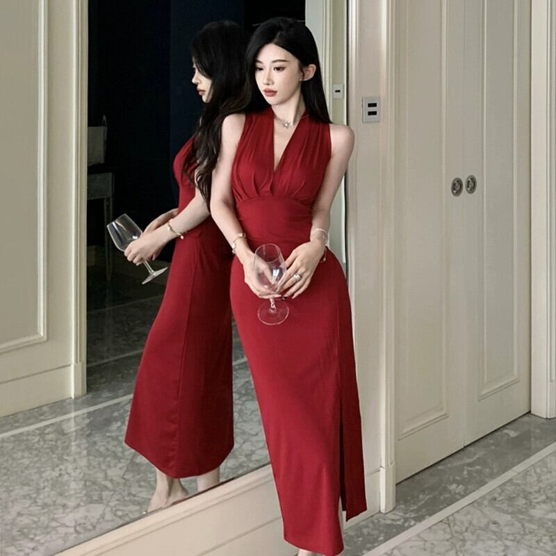 フレンチイブニングドレス、赤い新年パーティー、クリスマスパーティー、セクシーなノースリーブミドル丈ドレス レッド yeyij7895097089