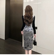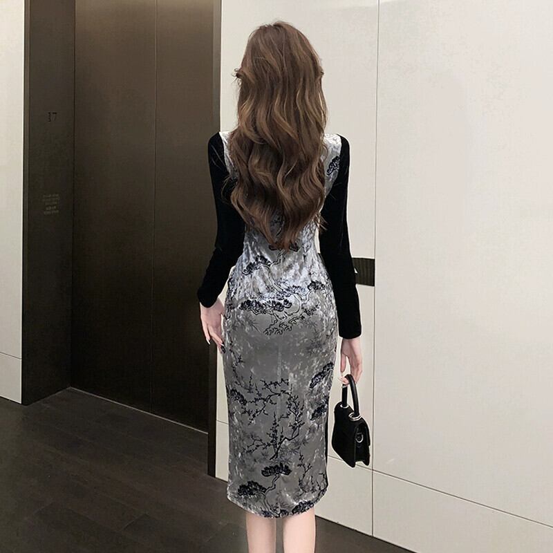 チャイナドレスの改良版女性の新しい中国風の秋と冬の若いスタイルのハイエンドの気質中国風のゴールドベルベットのミドルドレス オータム 秋物 ウィンター 冬物 yeyij3888497808