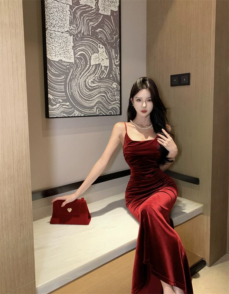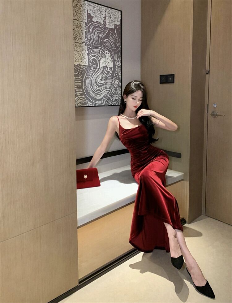 高級感のある赤いイブニングドレスのロングスカートの女性、シンプルでエレガントな気質、セクシーなゴールドベルベットのサスペンダードレスが年次総会に登場します レッド yeyij29315090050