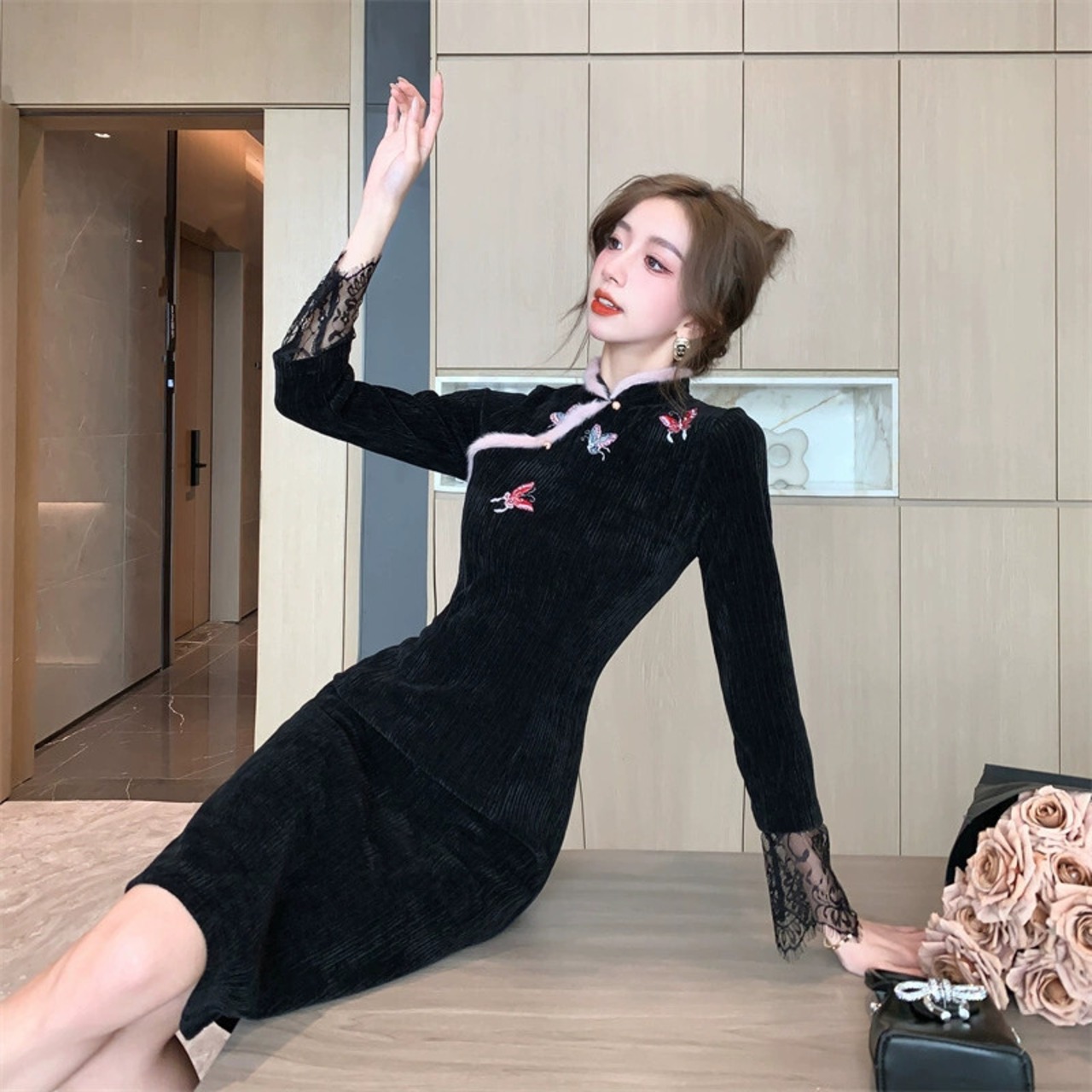 改良版のチャイナドレス女性の新しい中国の秋と冬のハイエンドの若いスタイルのコーデュロイ刺繍入りデイリーチャイナスタイルドレス レッド オータム 秋物 ウィンター 冬物 yeyij52775721215