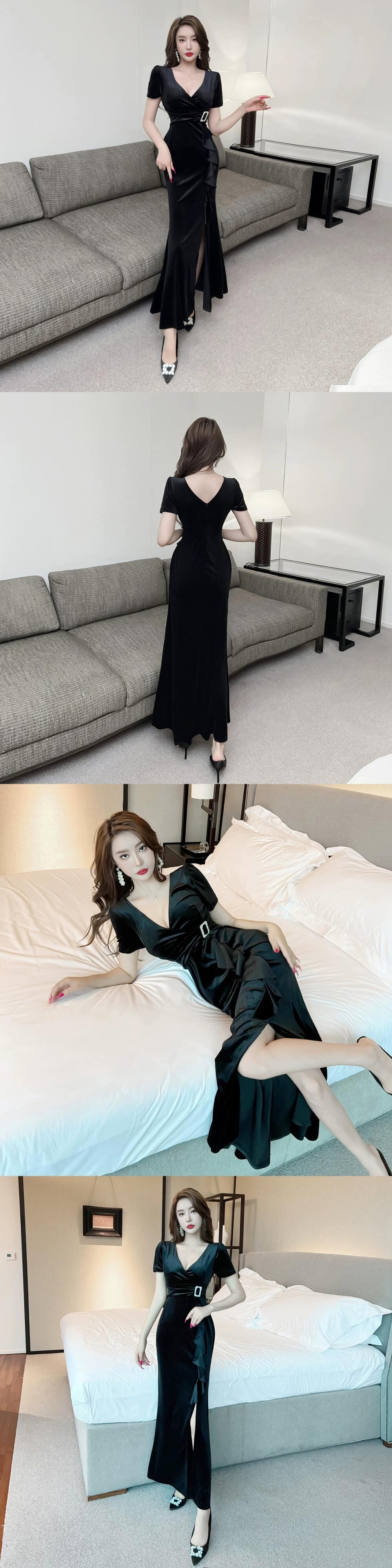 イブニングドレス女性ナイトクラブナイトクラブ作業服テクニシャンオーバーオールロングスカートセクシーな V ネックゴールドベルベットドレス Vネック yeyij66936232386