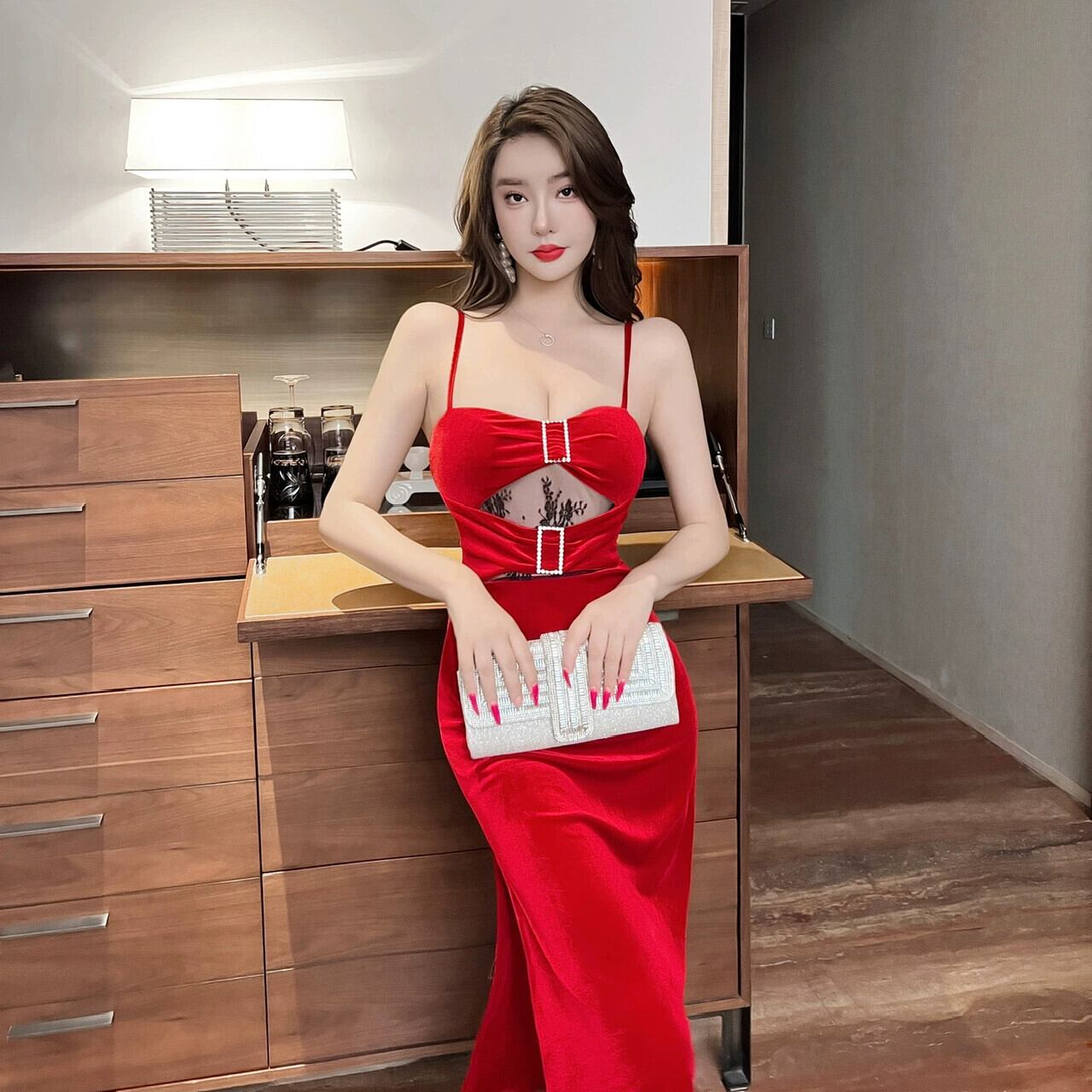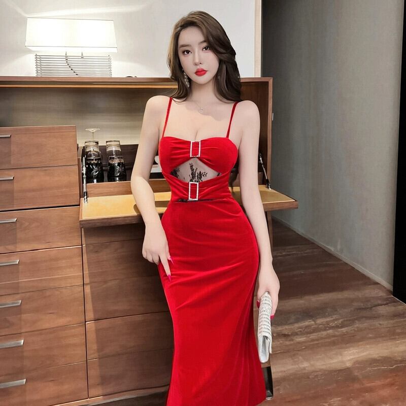 イブニングドレスの女性のナイトクラブナイトクラブオーバーオールロングスカート気質セクシーなレーススプライシングゴールドベルベットサスペンダードレス yeyij72218835758
