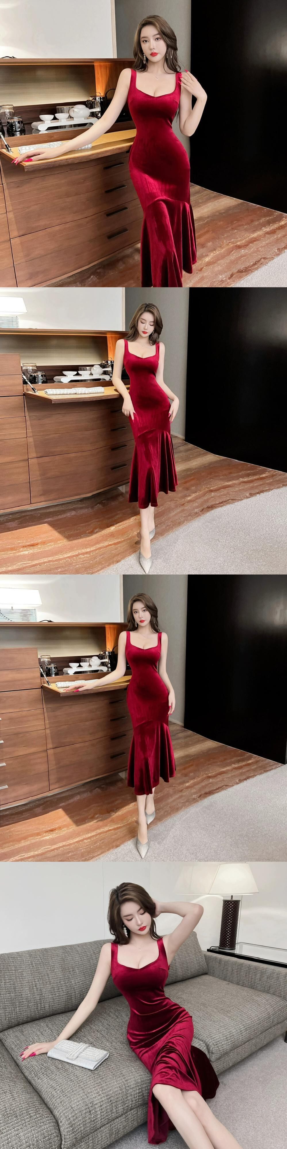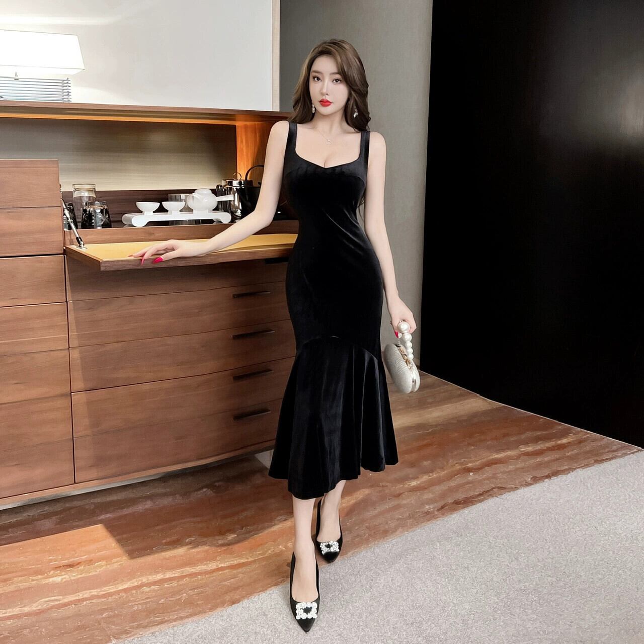 高級宴会の気質を持つイブニングドレスの女性、シンプルでエレガントなナイトクラブのセクシーなスクエアネックベルベットサスペンダーフィッシュテールドレス スクウェア yeyij6246934545