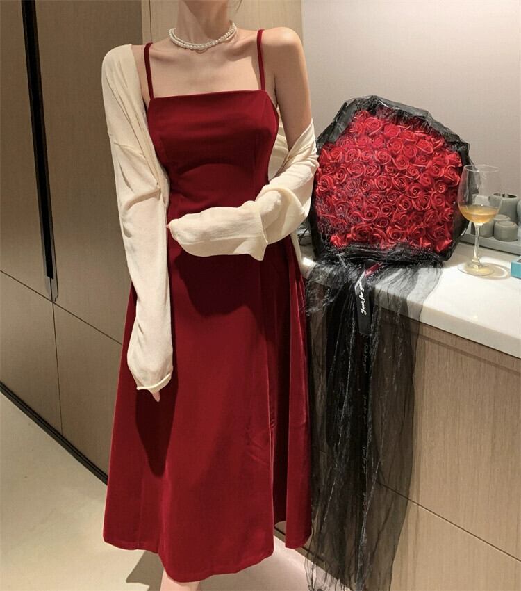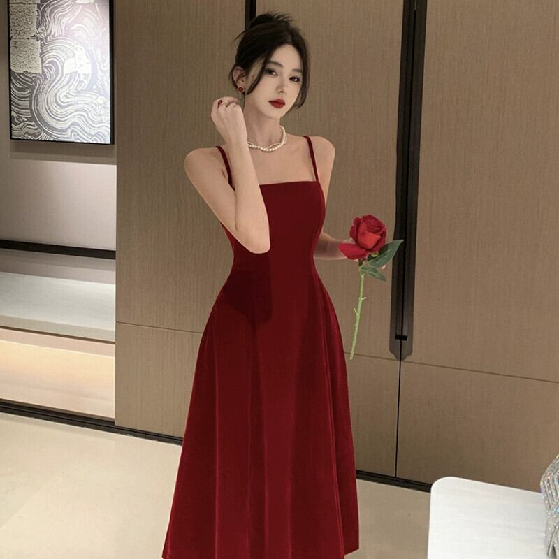 イブニングドレスの女性、高級年末パーティー、クリスマス婚約、赤いウエスト痩身とセクシーなミッドレングスのサスペンダードレス レッド yeyij6763083328
