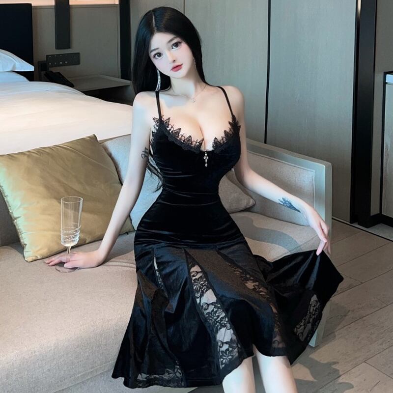 ナイトクラブ、ナイトクラブ、宴会のイブニングドレスの女性、エレガントなロングスカート、レースのスプライシング、セクシーなゴールドベルベットのサスペンダードレス yeyij12046765959