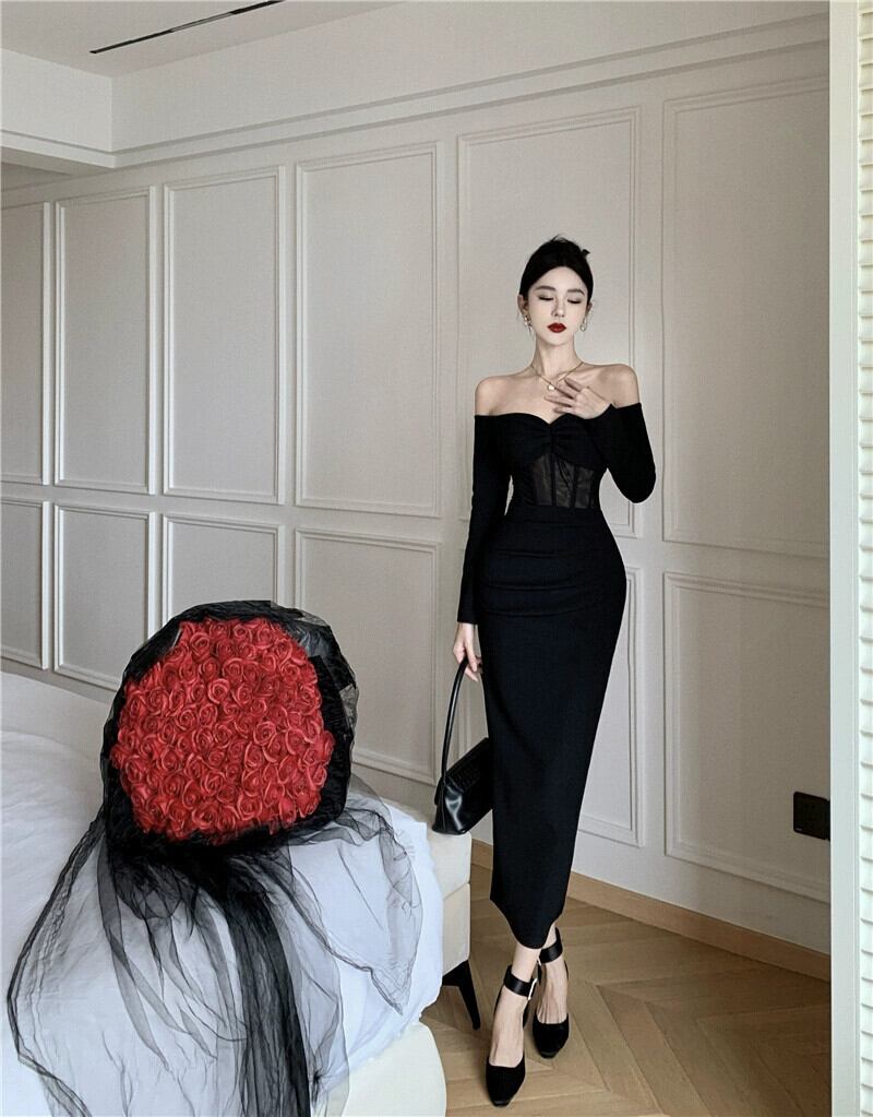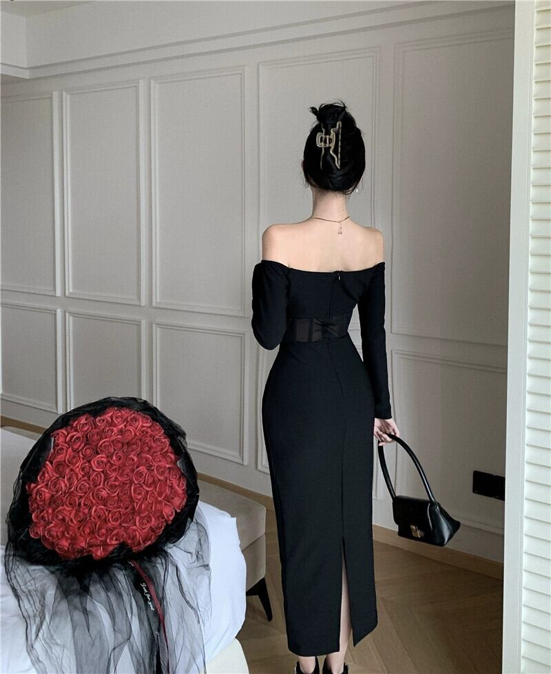 ヘップバーンスタイルのイブニングドレス、フェミニン、ライト、ラグジュアリー、ニッチ、ハイエンド、フレンチスタイルのセクシーなブラックワンショルダーチューブトップドレス yeyij40305100676