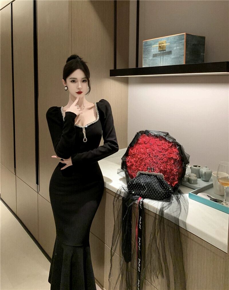 フレンチドレス小さなイブニングドレスの女性、ハイエンドヘップバーンスタイルの黒の宴会見事なセクシーなスクエアネックフィッシュテールドレス ブラック スクウェア yeyij20625404695