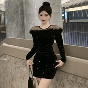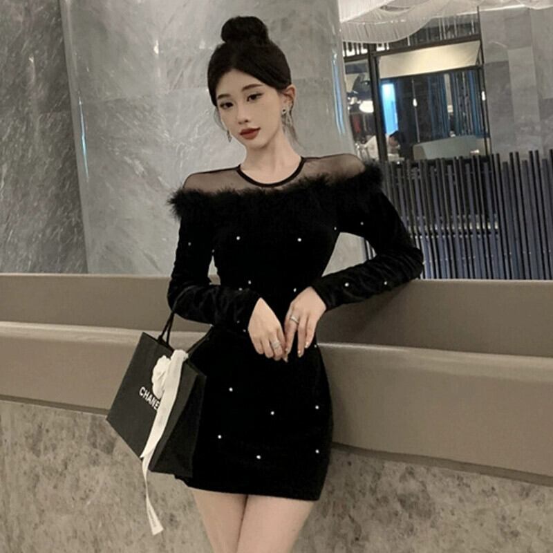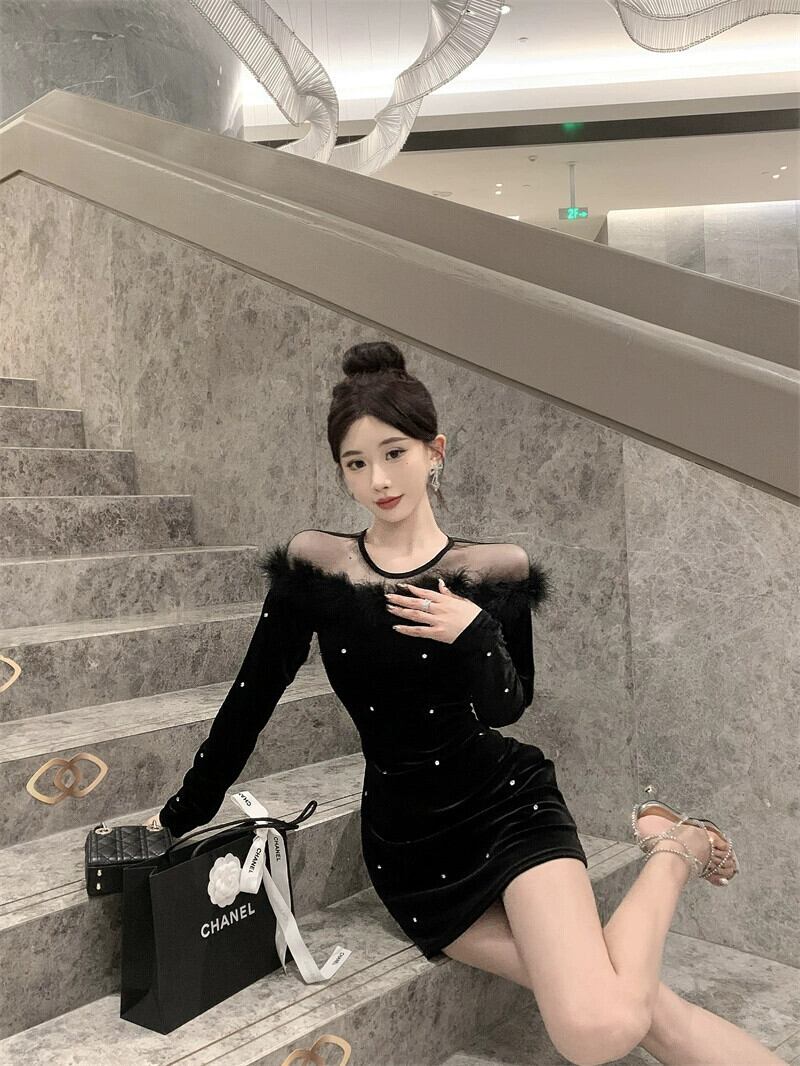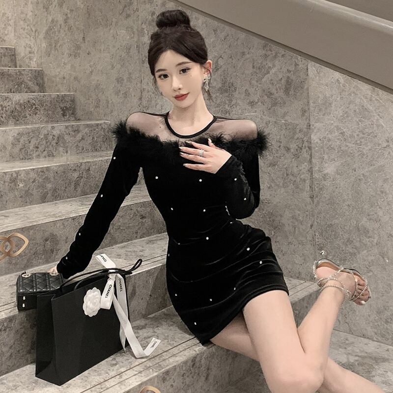 Pogenic 衣類生放送女性アンカー、ハイエンドのセクシーなゴールドベルベットとファーメッシュスプライシング長袖オフショルダードレス ロング yeyij62752873606