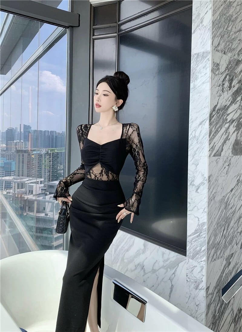 フレンチライトドレスはパーティーや宴会などで着用いただけます。ブラックのセクシーなレーススプライシングミッドレングスドレス yeyij84675072303