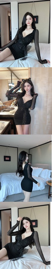 ナイトクラブの女性のナイトクラブの作業服、技術者の作業服、スパンコールメッシュステッチ、セクシーなローカット V ネックドレス Vネック yeyij5898299399