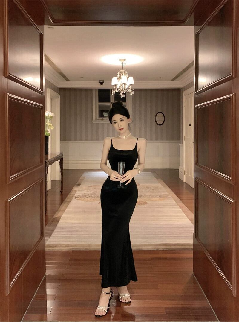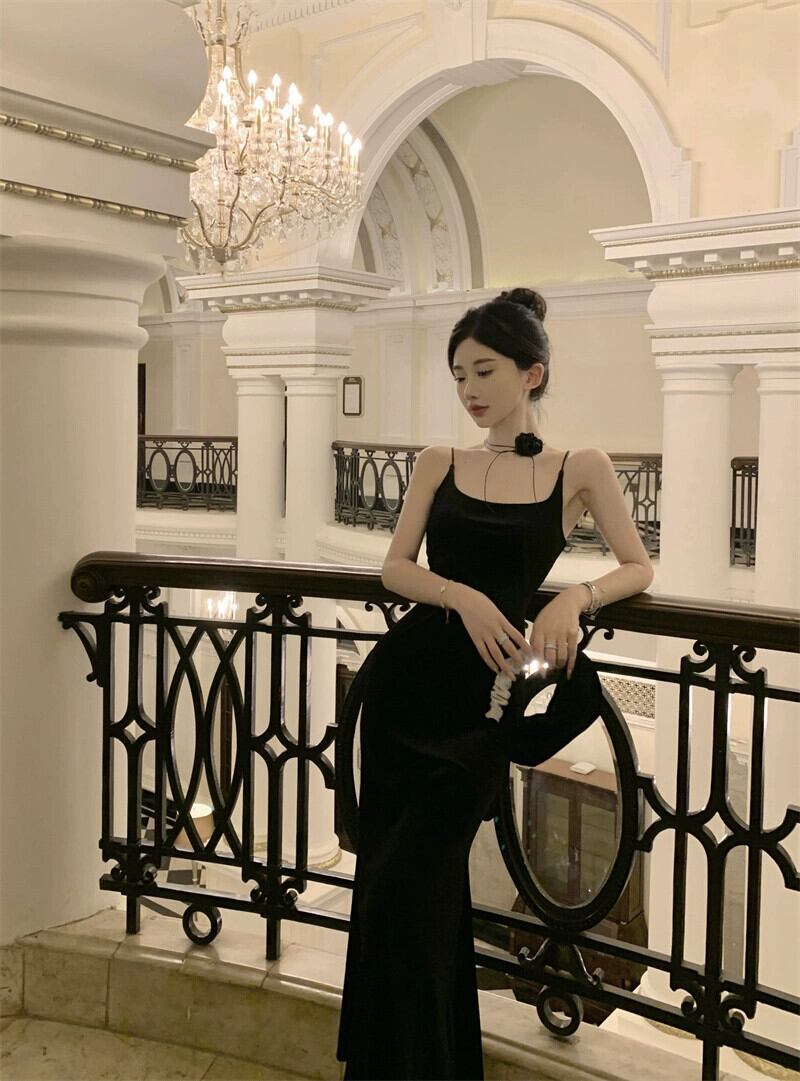 フレンチドレス小さなイブニングドレス女性ハイエンドシンプルでエレガントな年次総会宴会ロングドレスセクシーなサスペンダードレス yeyij22296480662