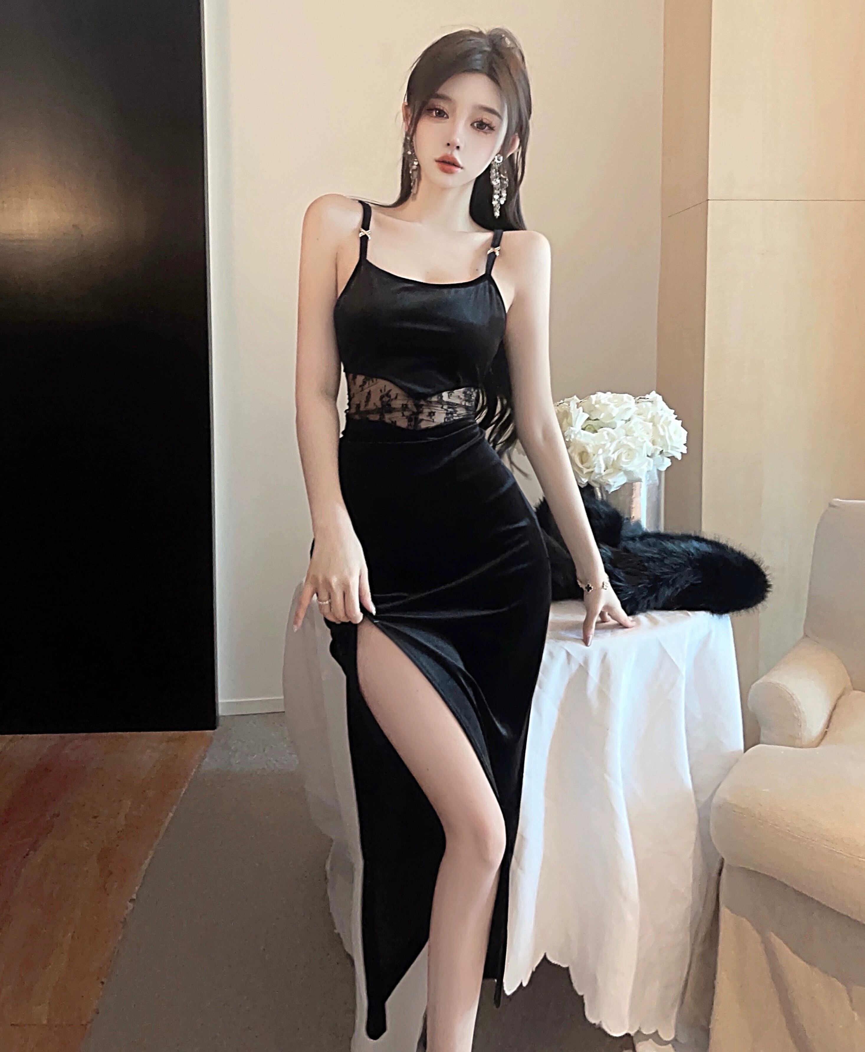 黒のイブニングドレスの女性、高級フレンチスタイルの年次総会、ゴールドベルベットレースステッチ、セクシーなミッドレングスのサスペンダードレス ブラック yeyij11726092461