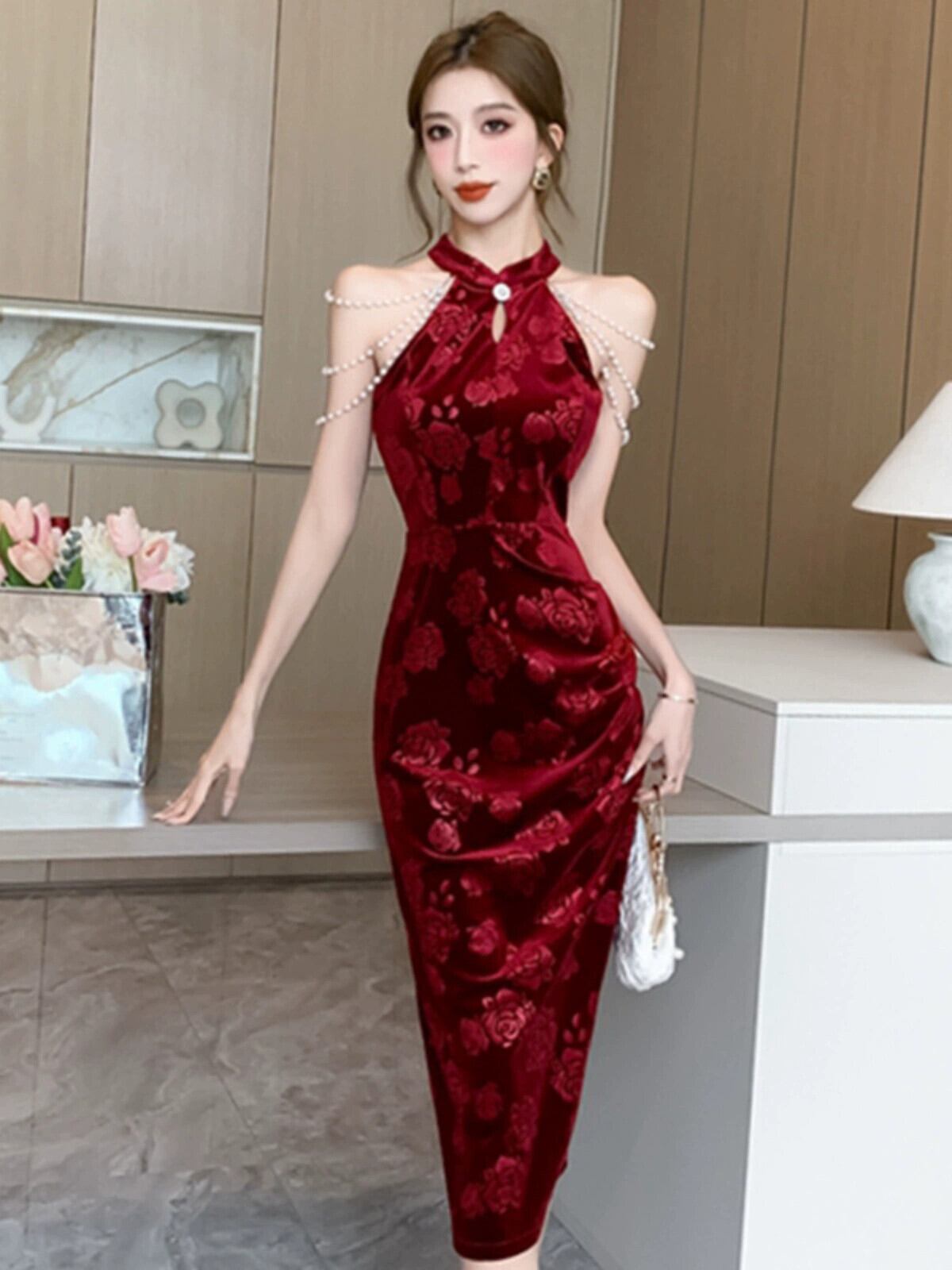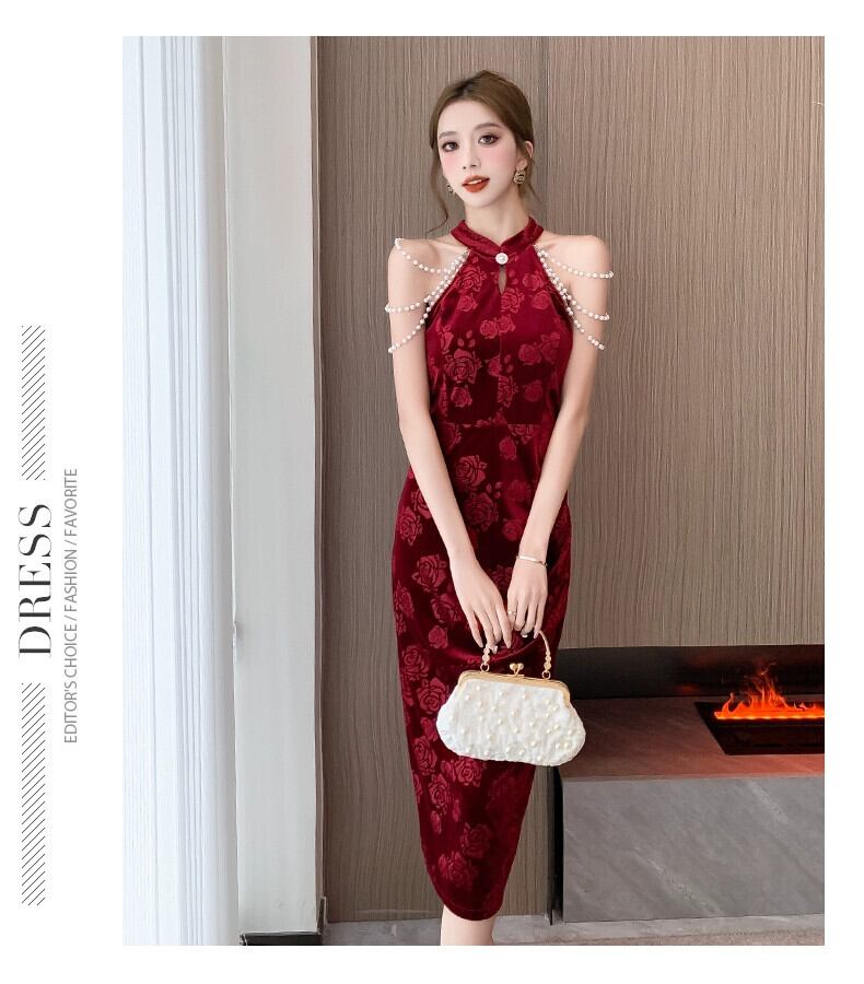 チャイナドレスイブニングドレス女性の終了年次総会宴会乾杯着用赤い気質中国風のセクシーなホルタードレス レッド yeyij93143982276