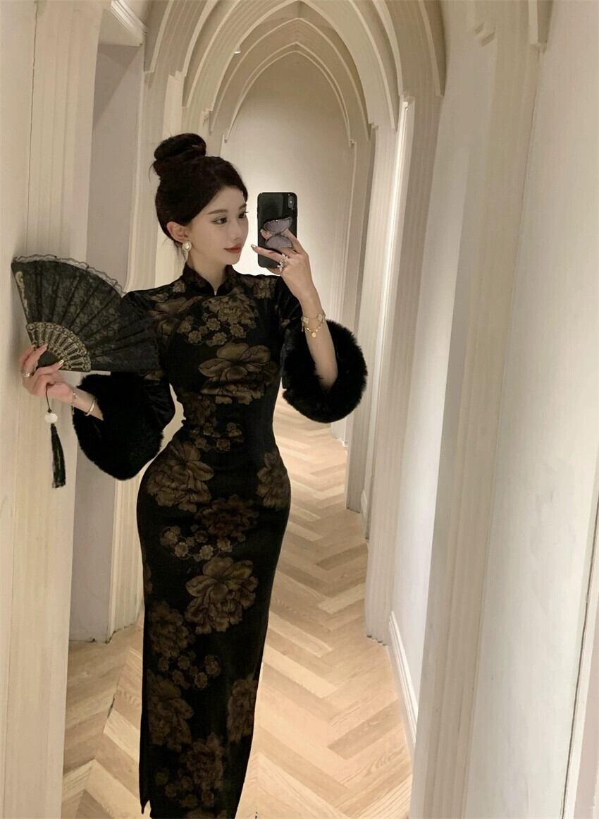 チャイナ イブニング ドレスの女性の秋と冬のハイエンド年次総会宴会気質七分袖レトロ改良中国風ドレス オータム 秋物 ウィンター 冬物 yeyij55127410976