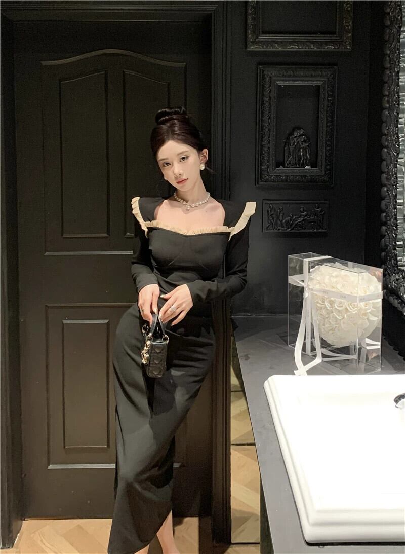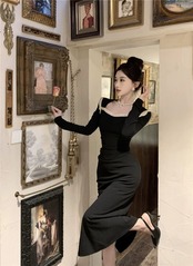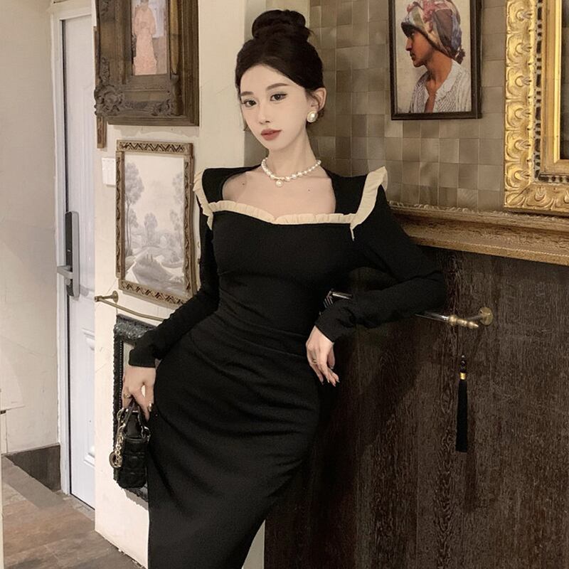 フレンチライトイブニングドレス女性、ハイエンドブラックヘップバーンスタイルスクエアネックスリム長袖ミッドレングスドレス ロング スクウェア yeyij30125060587
