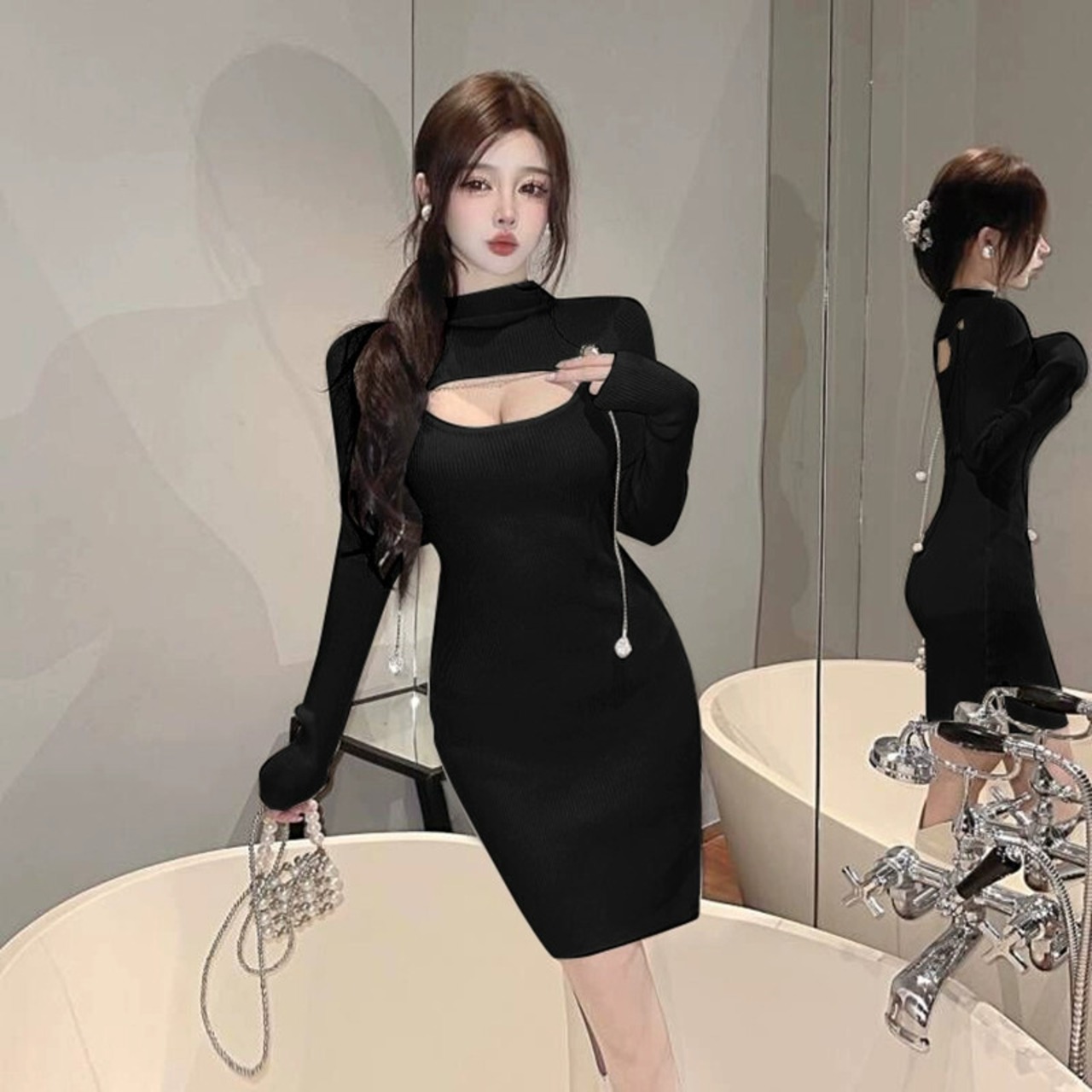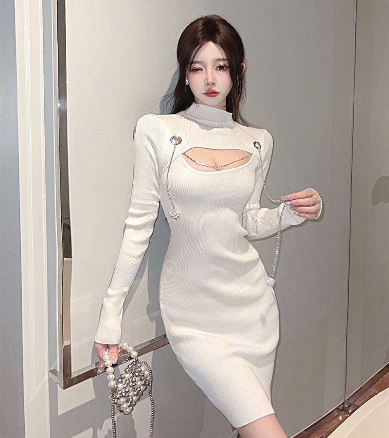 生放送の女性アンカーのポージェニックな服は、中空の胸とコートが付いたハイエンドの純粋な欲望のセクシーなセクシーなニットボトムドレスです。 ピュア yeyij99708878096