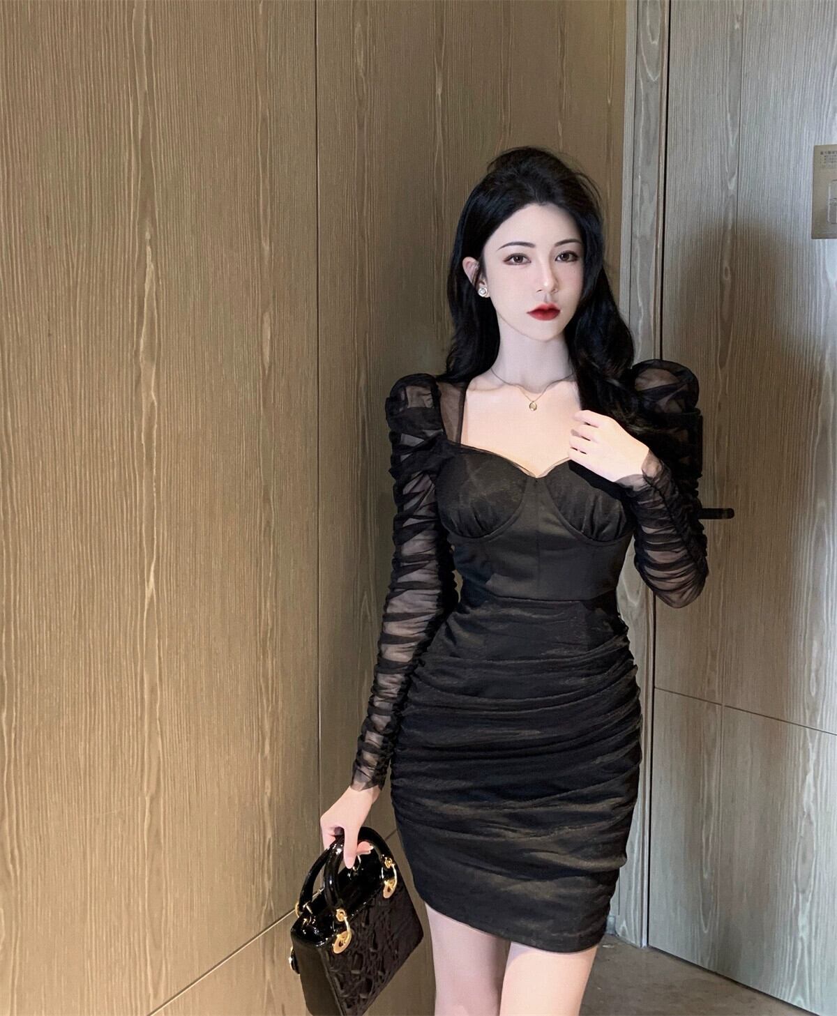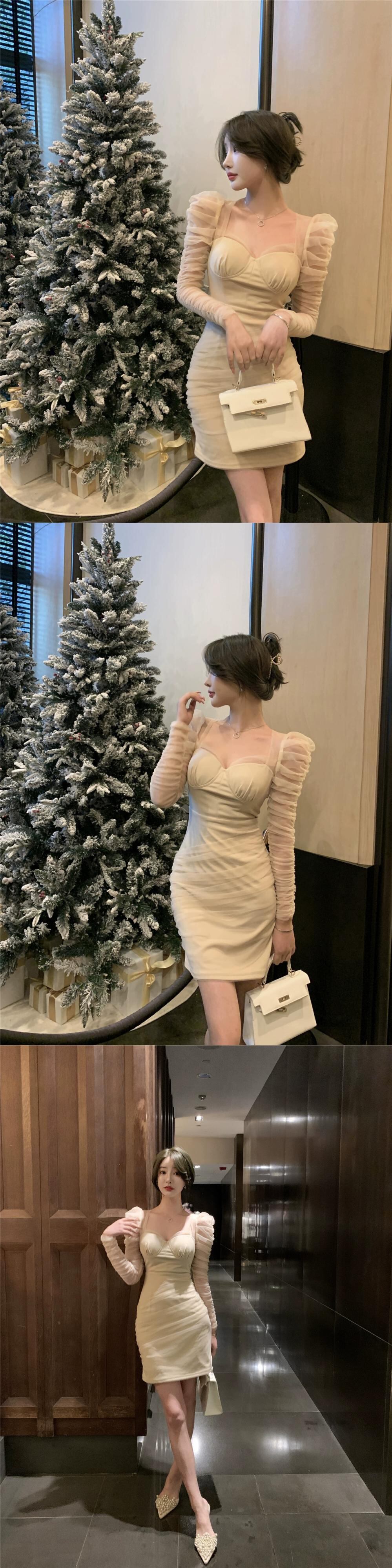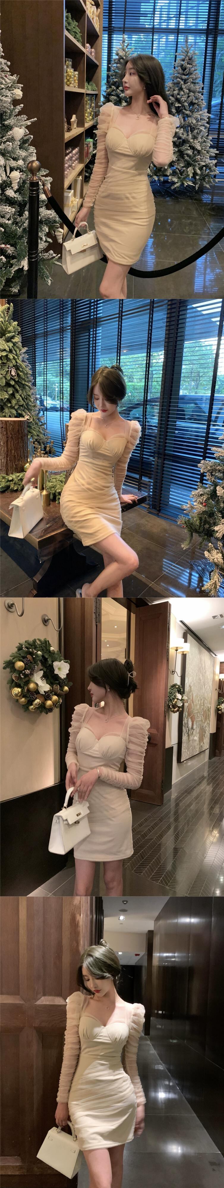 生放送の女性アンカーのポージェニックで高級感のあるレディライクなフレンチメッシュパフスリーブのセクシーなスクエアネックドレス スクウェア yeyij88213419508