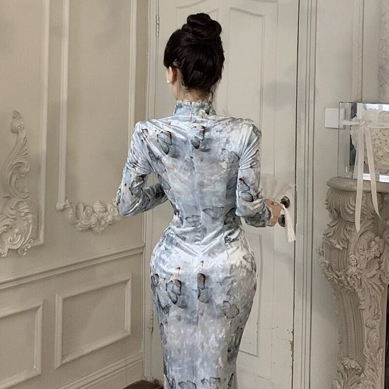 秋と冬のチャイナドレスの女性、ハイエンド、若い、レディライク、レトロな共和党スタイルのゴールドベルベットのミドル丈ドレス オータム 秋物 ウィンター 冬物 yeyij51208071861