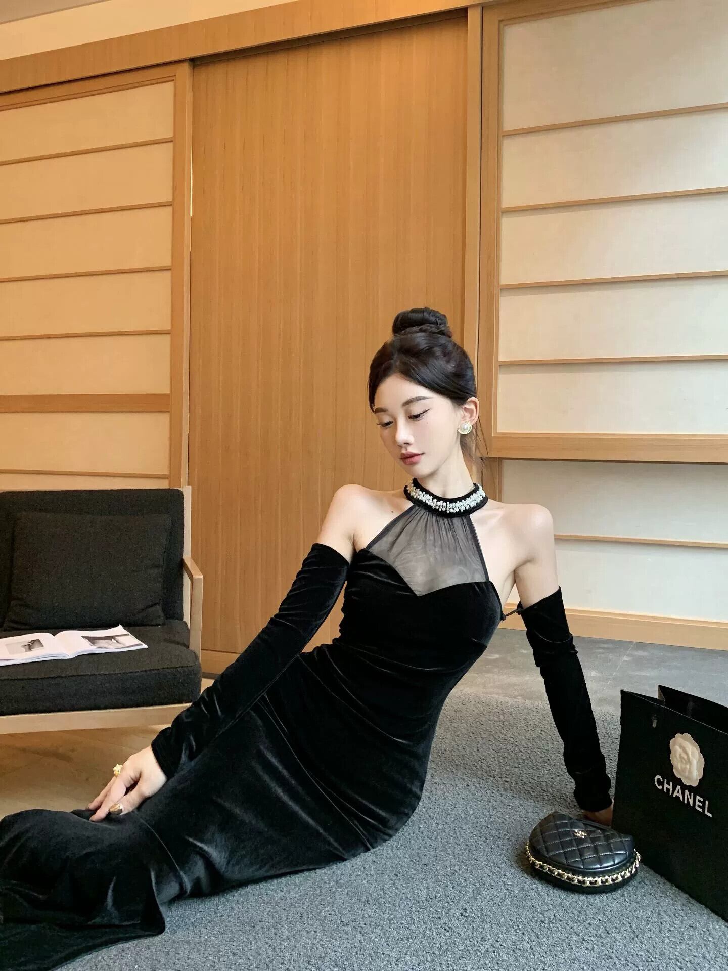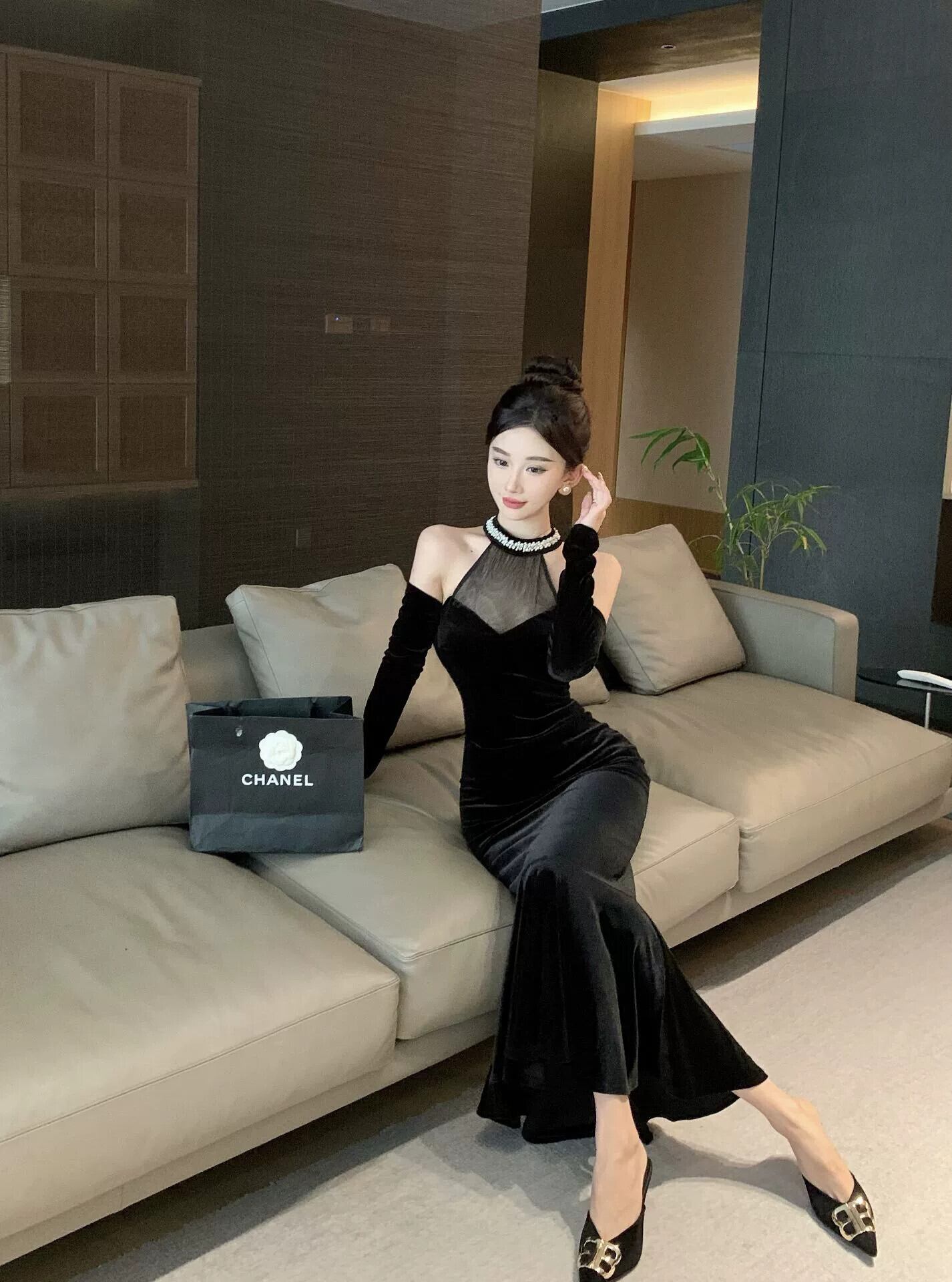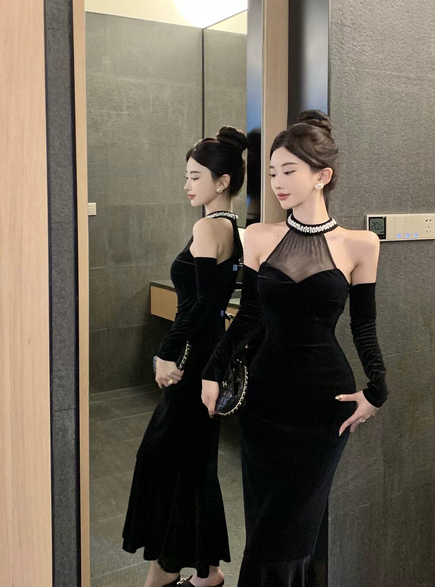 フレンチスタイルのイブニングドレスの女性、ハイエンドヘップバーンスタイルの黒のセクシーなメッシュスプライシングオフショルダーホルターネックドレス ブラック yeyij64002133339