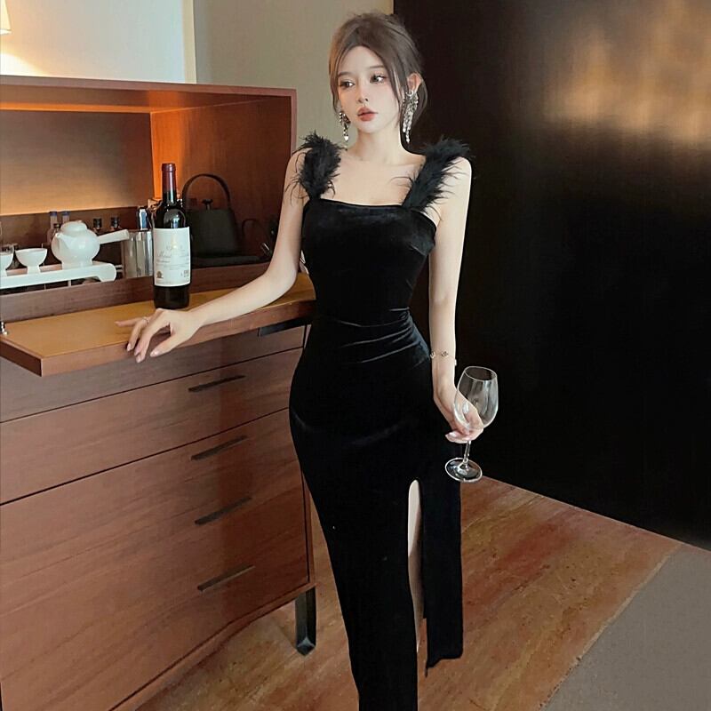 黒のイブニングドレス、高級年次パーティートーストドレス女性、ダチョウの羽、ゴールドベルベット、セクシーなサスペンダードレス ブラック yeyij13102792936