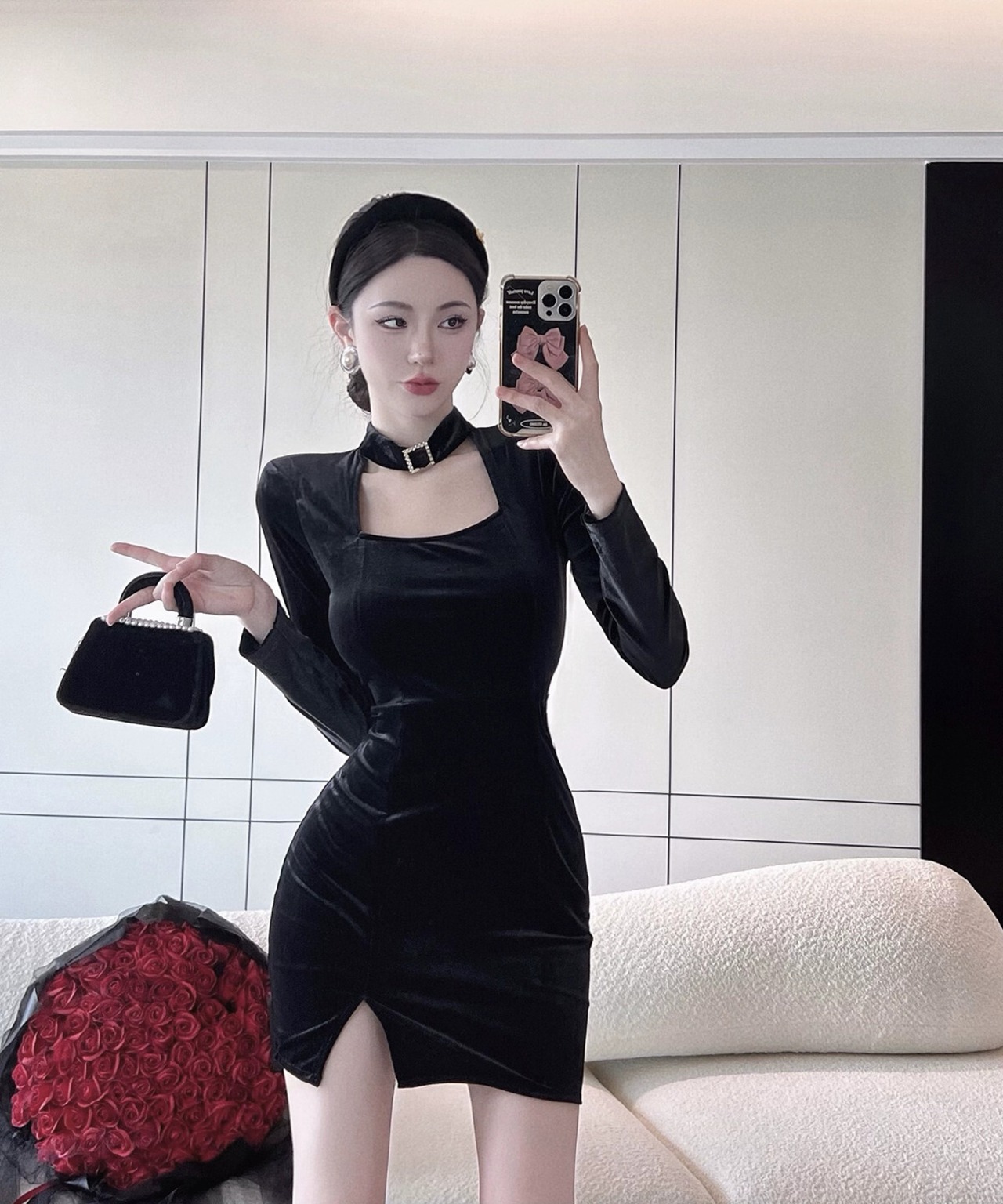 Pogenic 服装生放送女性アンカー、ハイエンドのセクシーな中空黒若者のチャイナ ドレスの改良版 ブラック yeyij49254338747