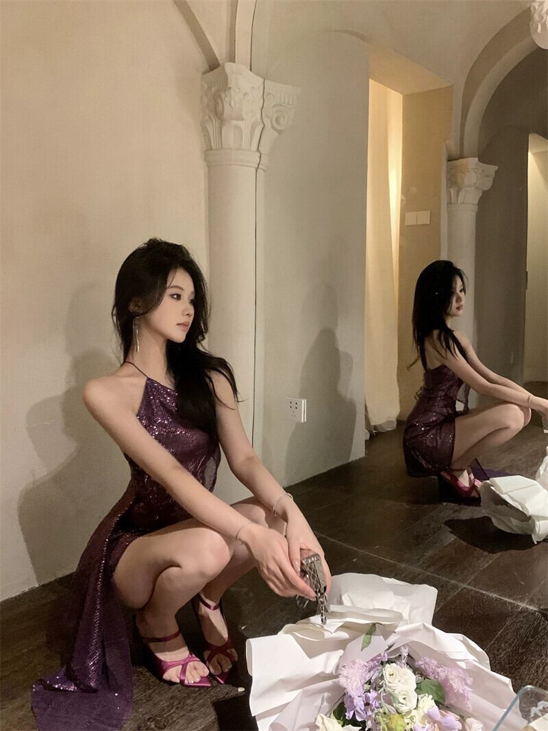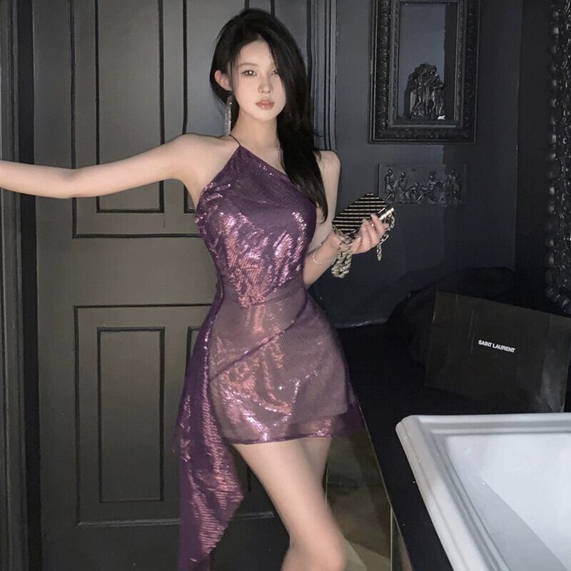小さな女性のイブニング ドレス、高級年次パーティー トースト ドレス、宴会輝くスパンコールのセクシーなワンショルダー サスペンダー ドレス yeyij55888736592