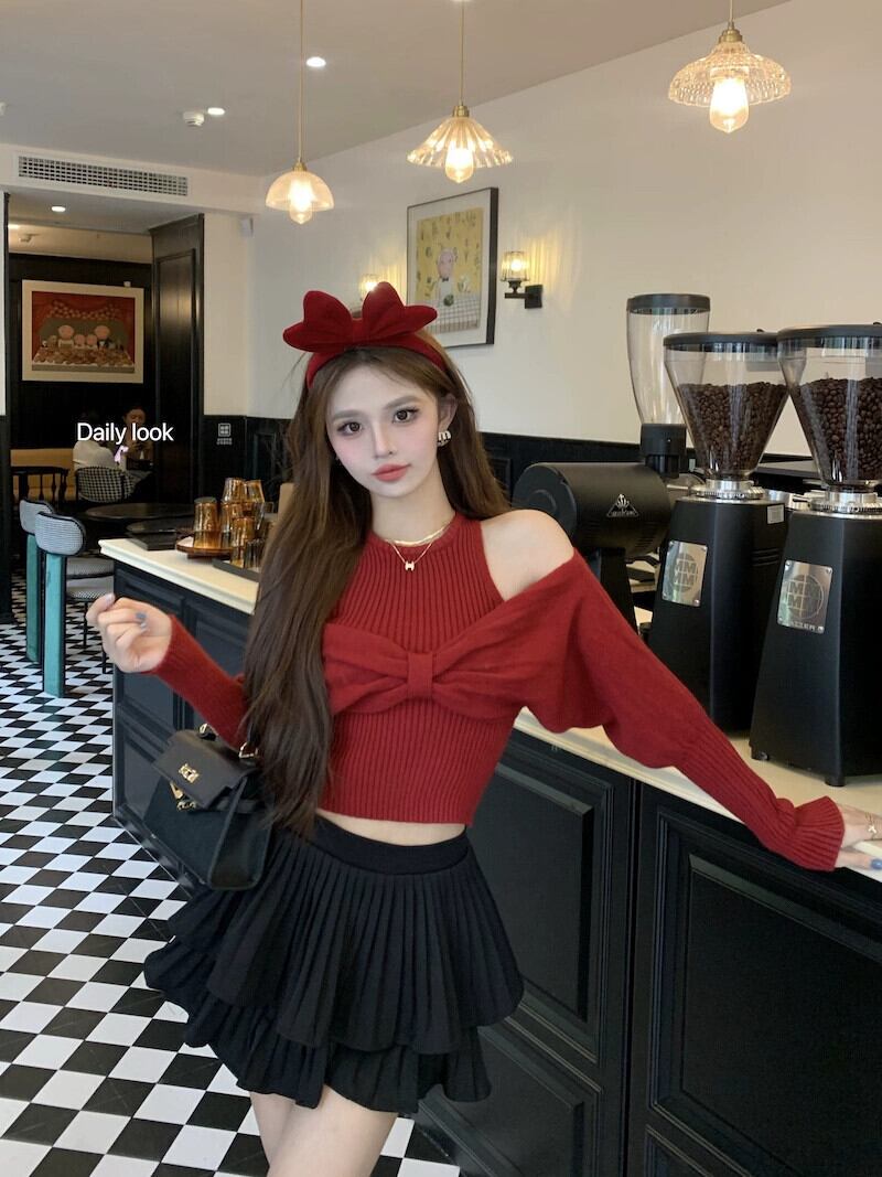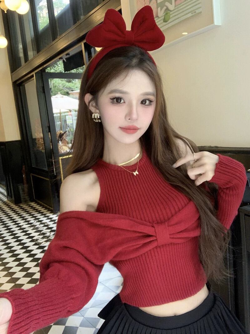 生放送女性アンカーの pogenic 服ハイエンドクリスマス赤い甘いセーターセクシーなオフショルダートップセーター レッド 大人ガーリー スウィート キュート カジュアル yeyij47295014104