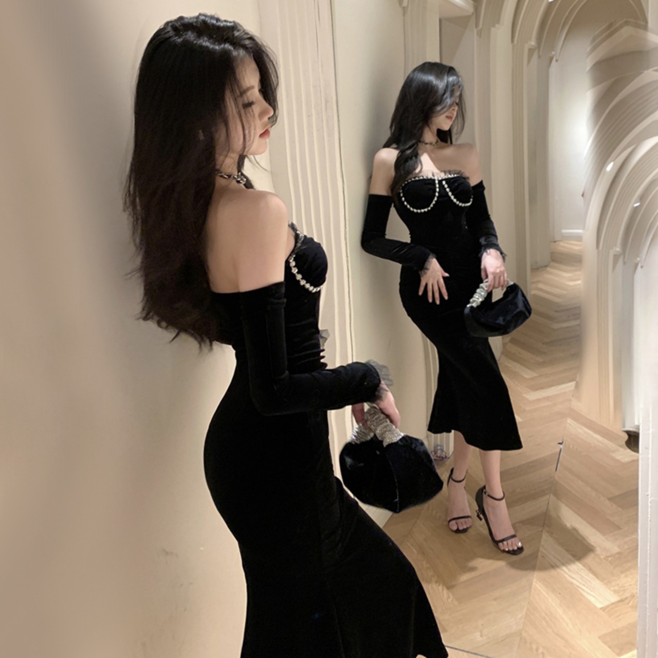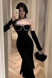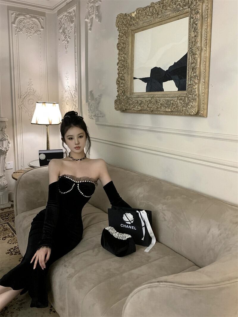 - 雰囲気のあるイブニングドレスの女性、フレンチヘップバーンスタイルのバンケットダイヤモンドがちりばめられたブラックのセクシーなチューブトップドレス yeyij92864574710