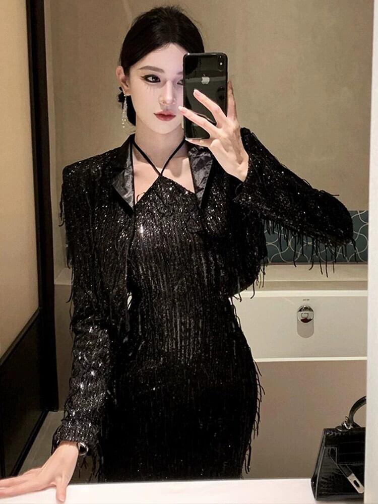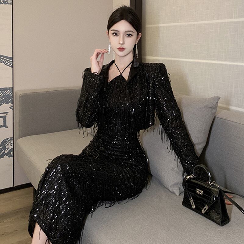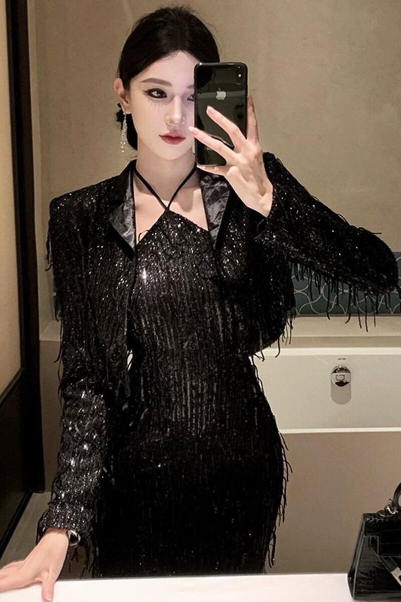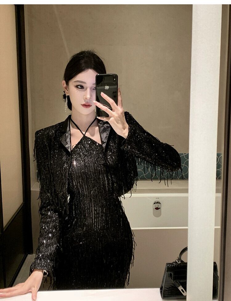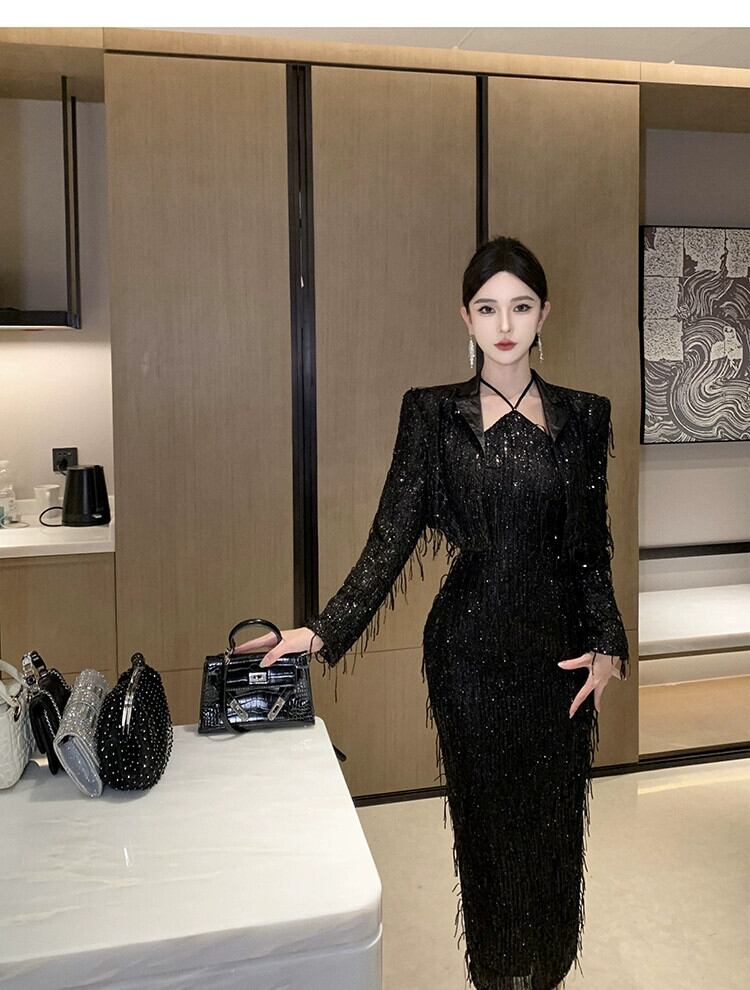 イブニングドレス女性、高級宴会、高級黒スパンコール小コート+ホルターネックサスペンダードレス2点セット ブラック yeyij65036418896