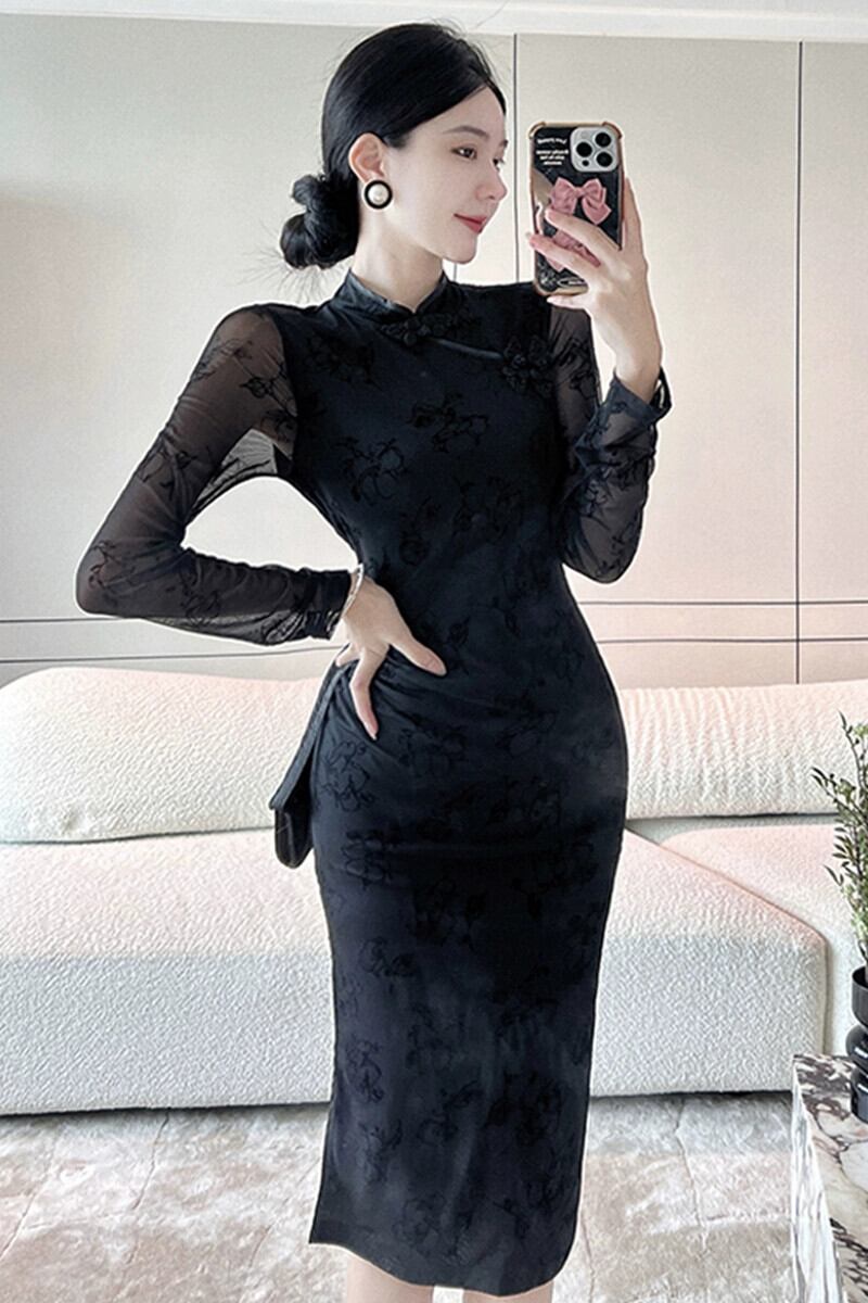チャイナドレス女性の新しい中国風の若いスタイルの秋の毎日の改良版セクシーな黒のメッシュのレトロな中国風のドレス ブラック オータム 秋物 yeyij14177321624
