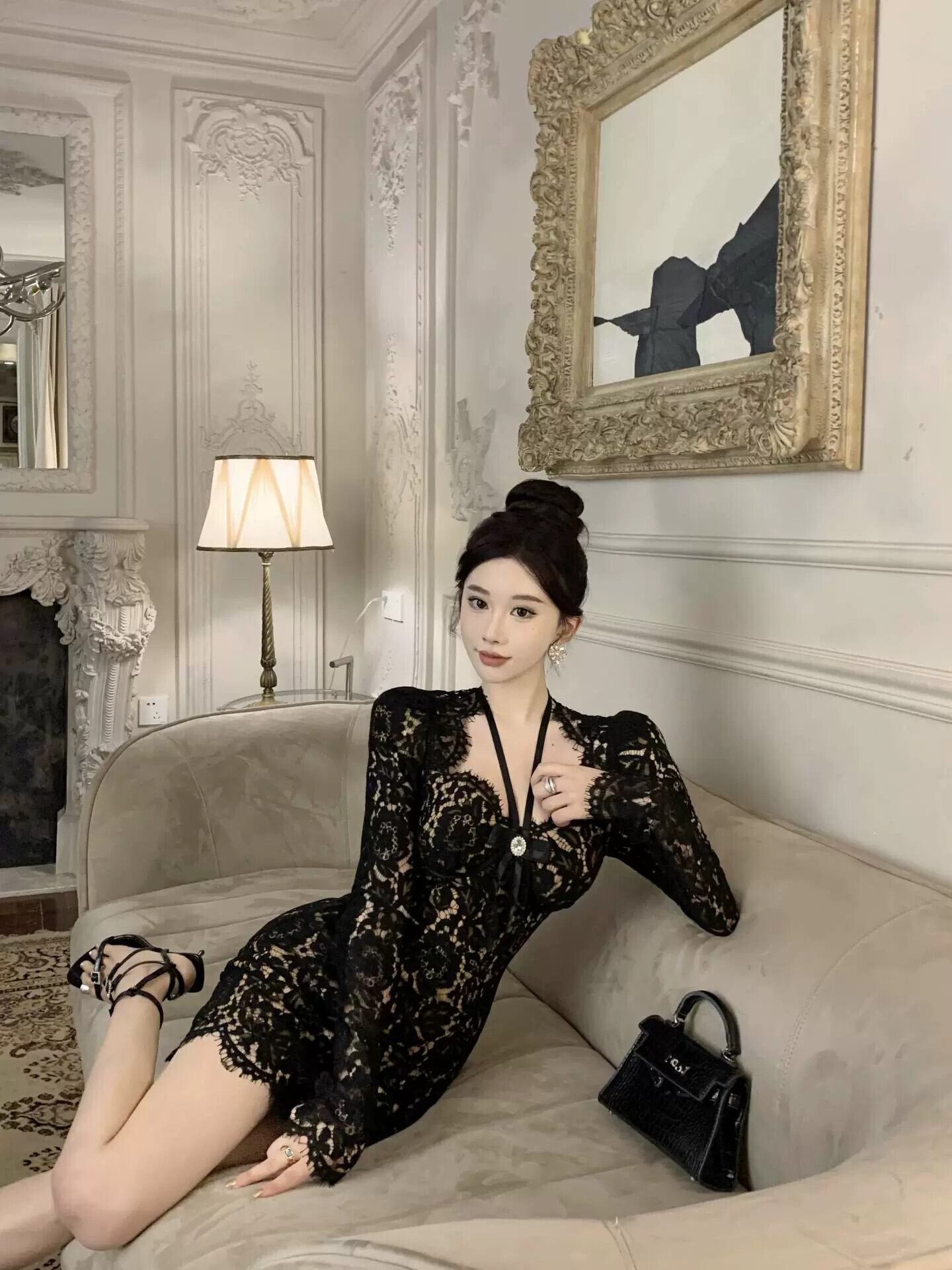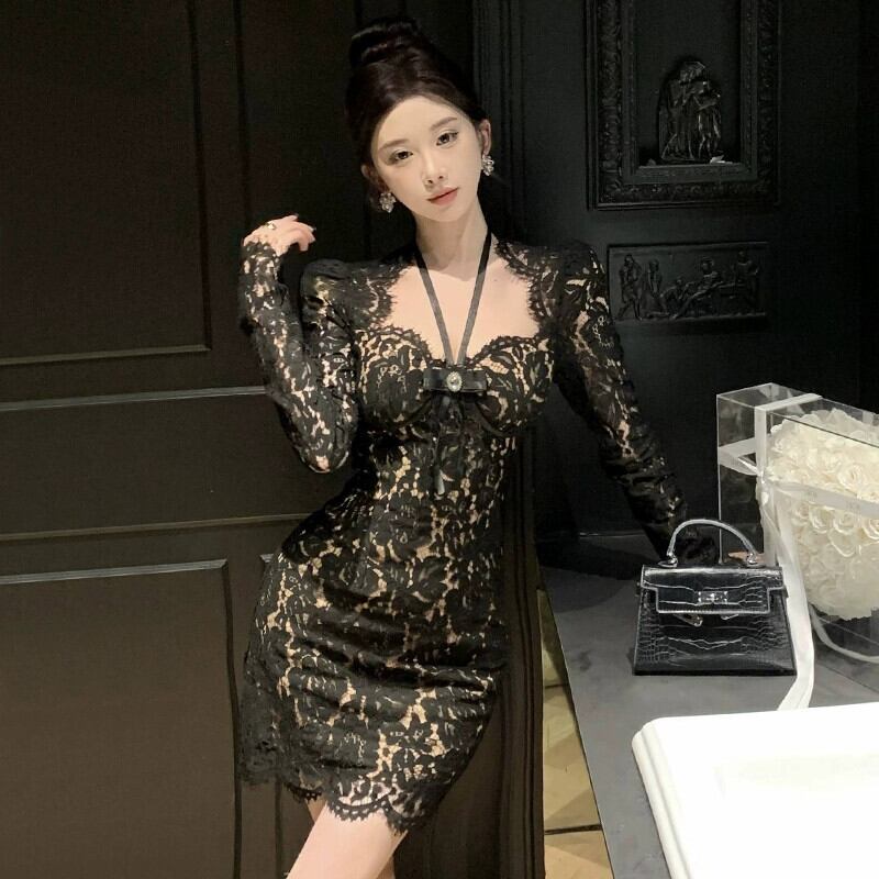 生放送女性アンカーのポージェニックな高級フランス淑女気質のセクシーなレースのホルターネックボトムドレス yeyij56170644280