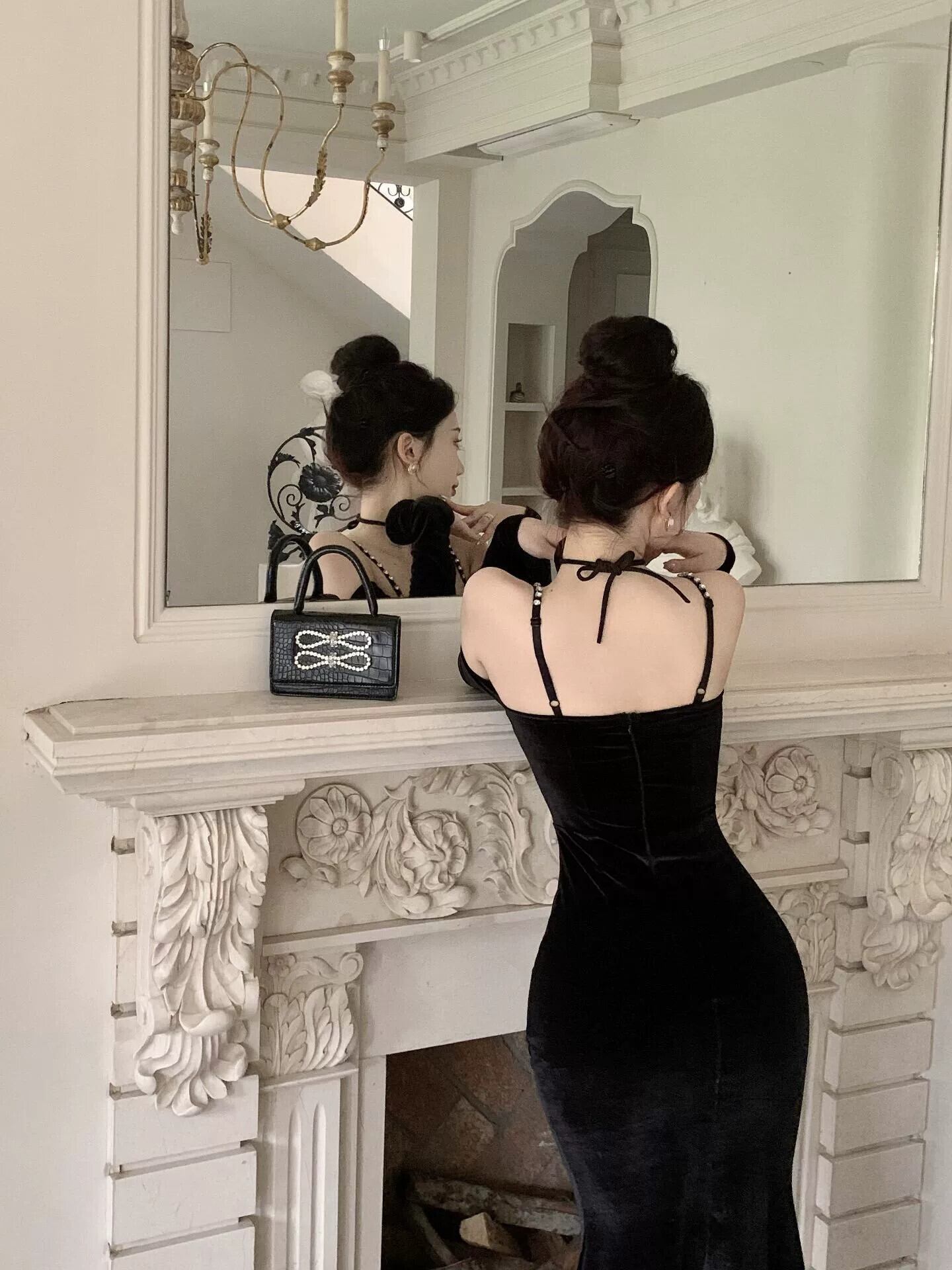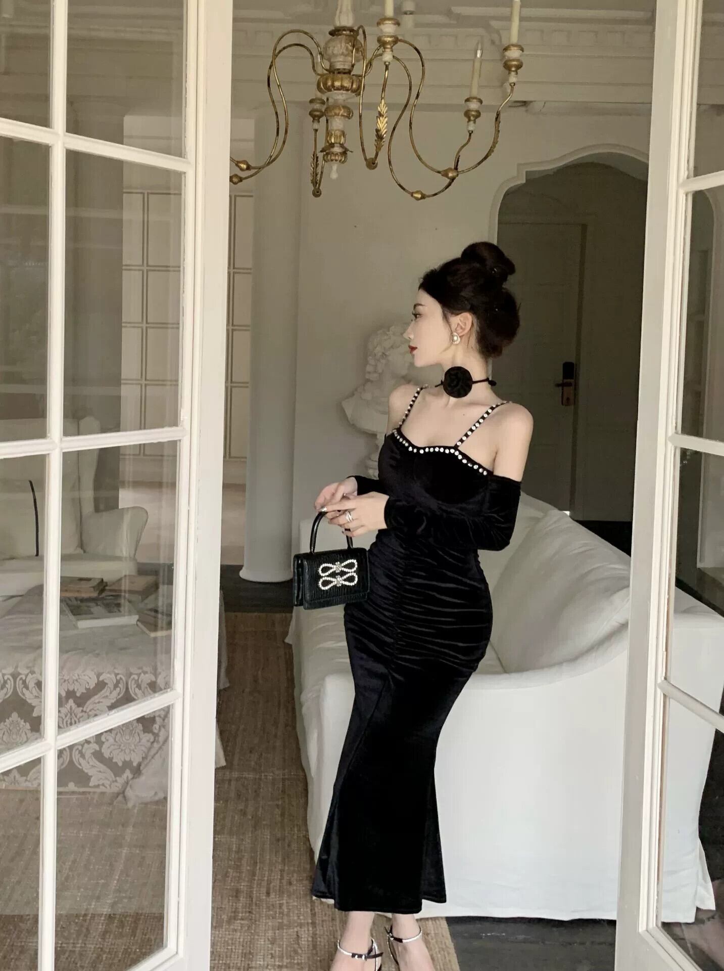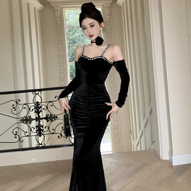フランスのイブニングドレスの女性、ハイエンドのニッチバンケット、黒のヘップバーンスタイルのセクシーな長袖オフショルダーサスペンダードレス ロング ブラック yeyij25279972561