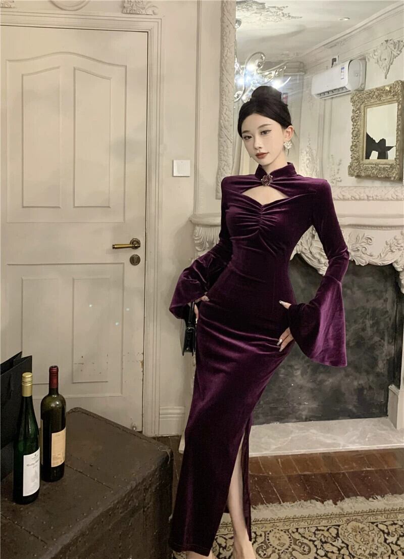 チャイナイブニングドレス女性の秋と冬の終わりライト高級ニッチ年次パーティー乾杯着用レトロ中国風ゴールドベルベットドレス オータム 秋物 ウィンター 冬物 yeyij64840436030