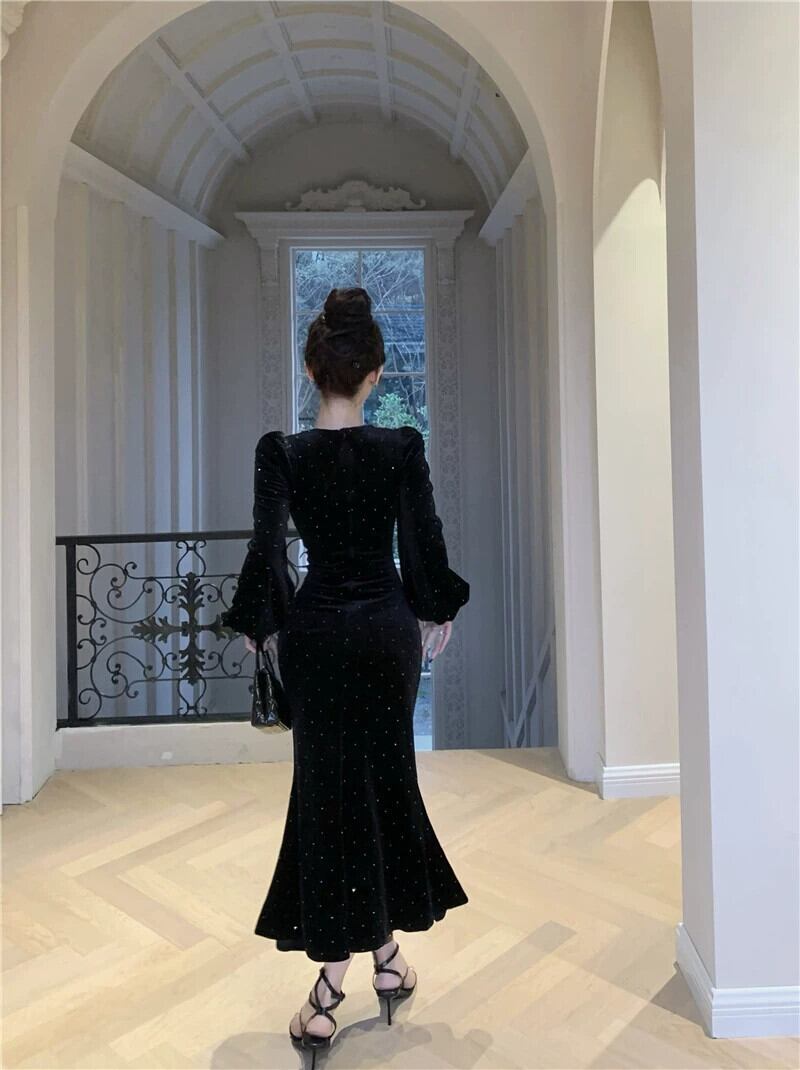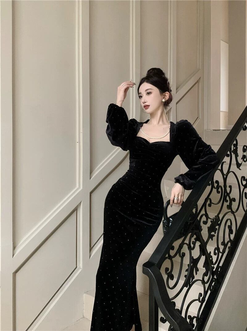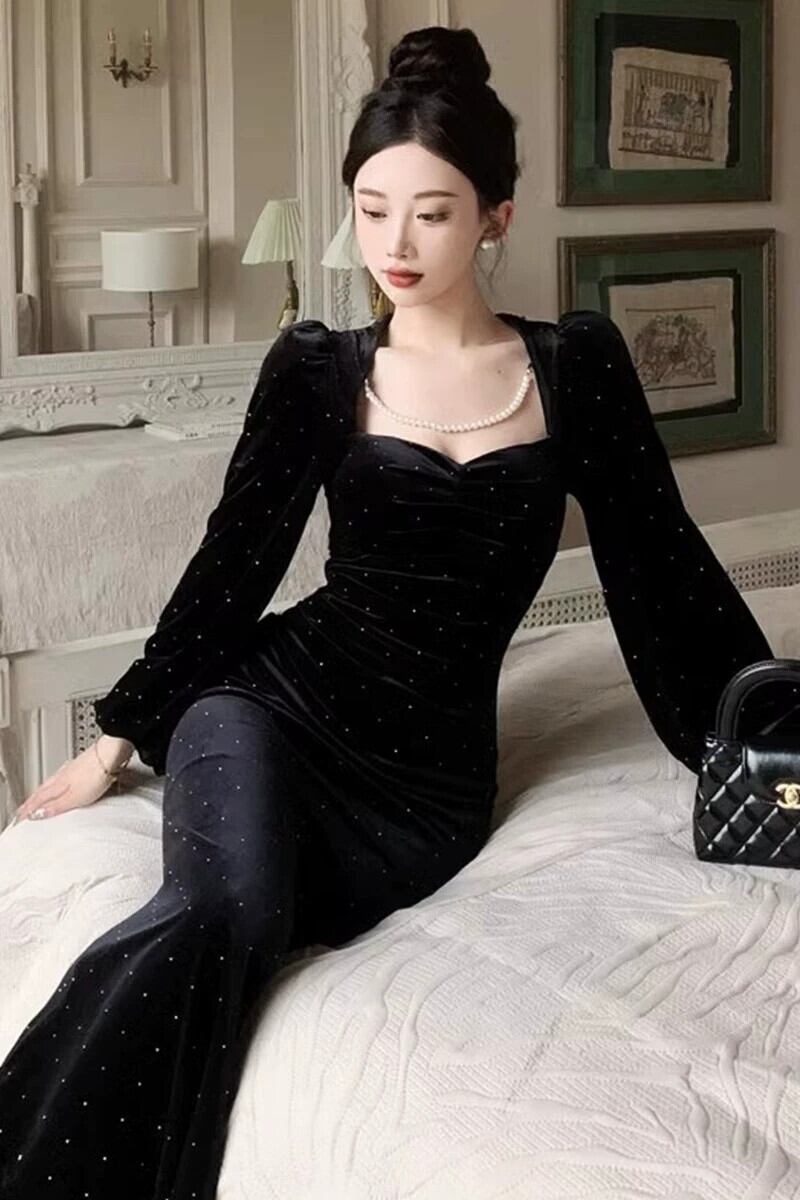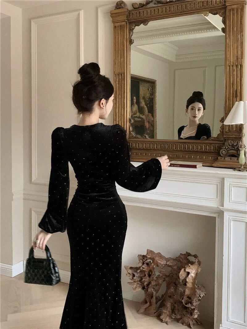 黒のイブニングドレスハイエンドの軽い高級ニッチ秋と冬フレンチヘップバーンスタイルのセクシーなゴールドベルベット長袖スクエアネックドレス ロング ブラック オータム 秋物 ウィンター 冬物 スクウェア yeyij67072808285
