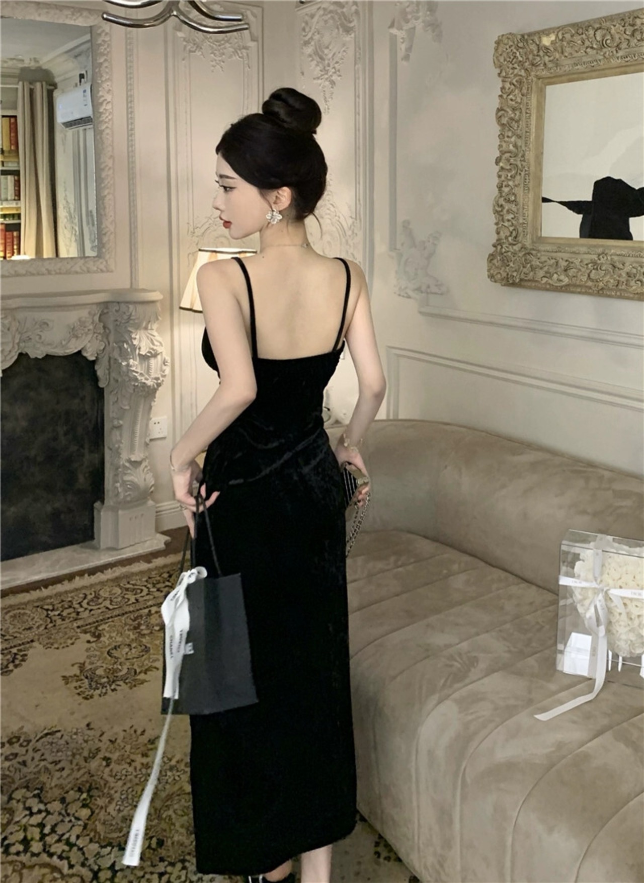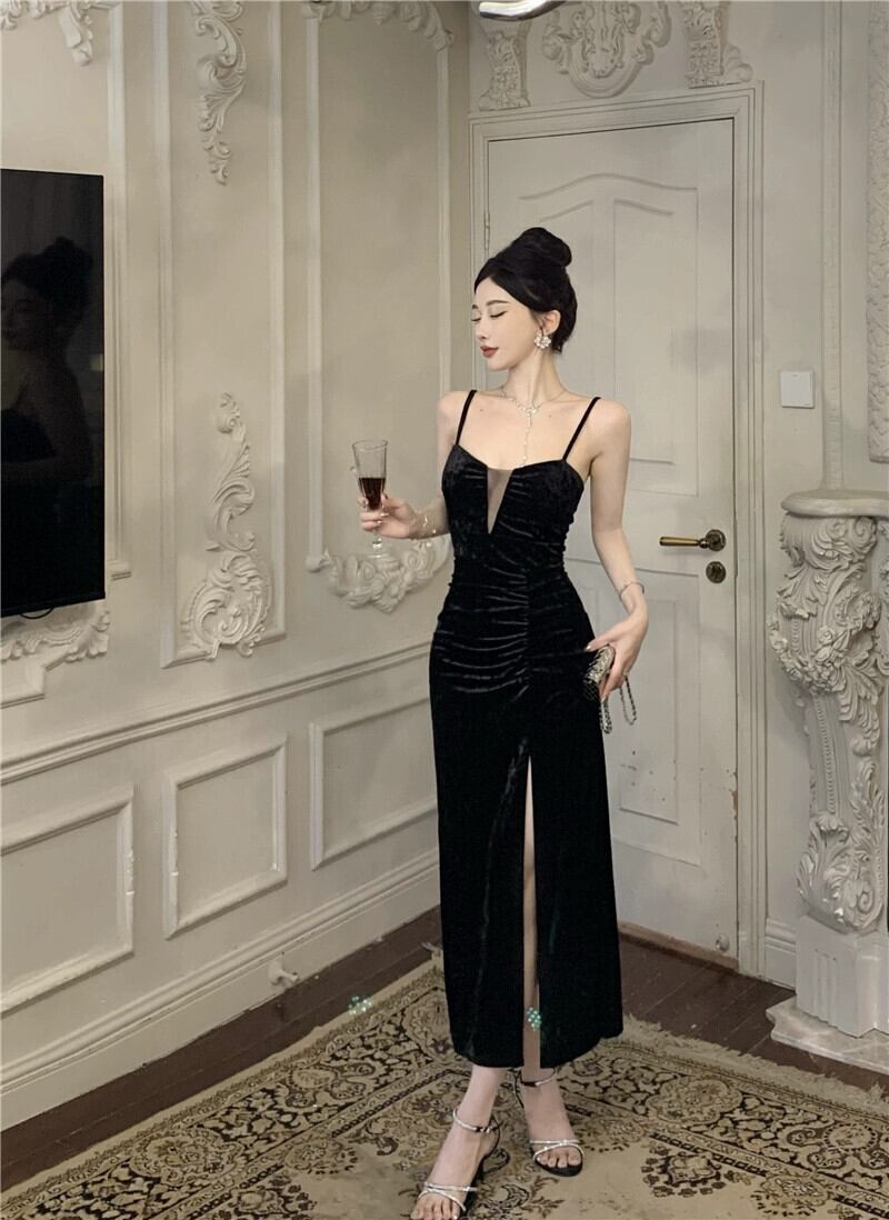 黒のイブニングドレス、ハイエンドの年次パーティートーストドレスレディース、ロングスカート、セクシーなメッシュステッチ、ローカットサスペンダードレス ブラック yeyij40637997739
