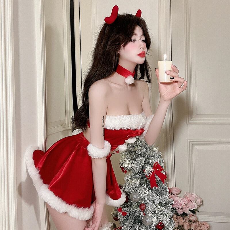 クリスマススーツの女性のシャツとスカーフとヘアアクセサリーレッドゴールドベルベットのセクシーな中空ウエストストラップレスドレス yeyij41194155625